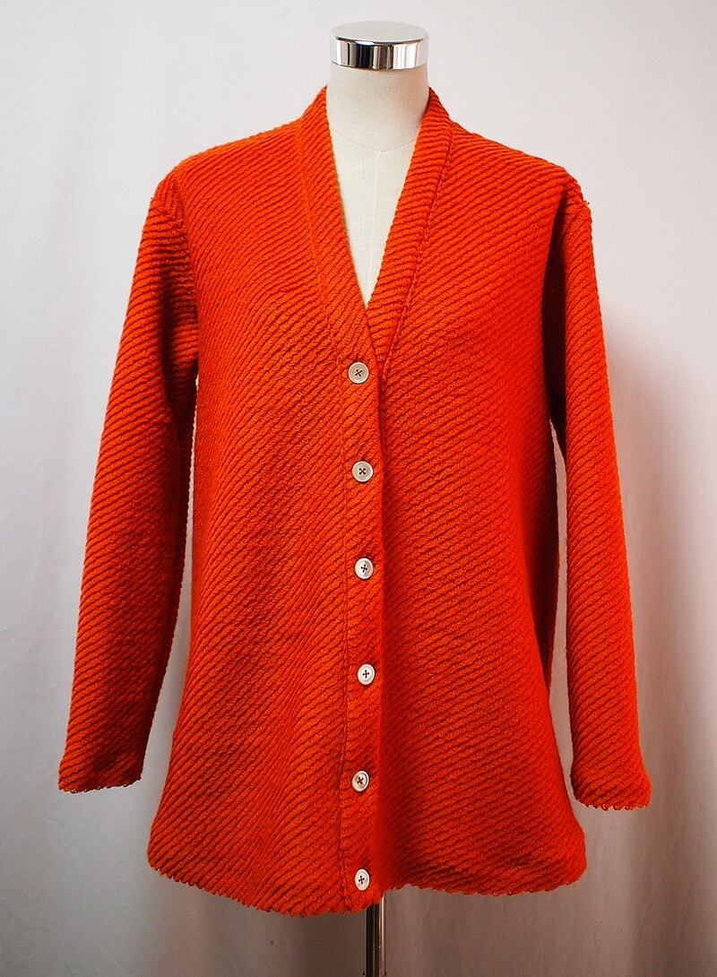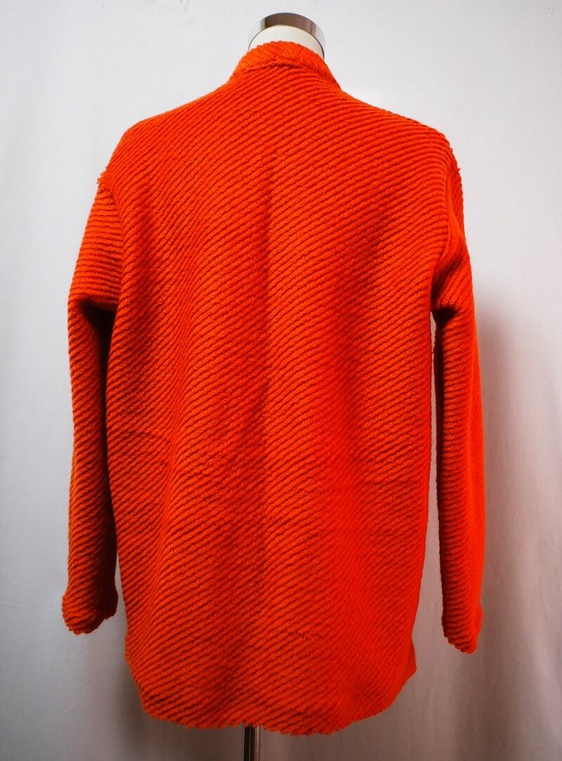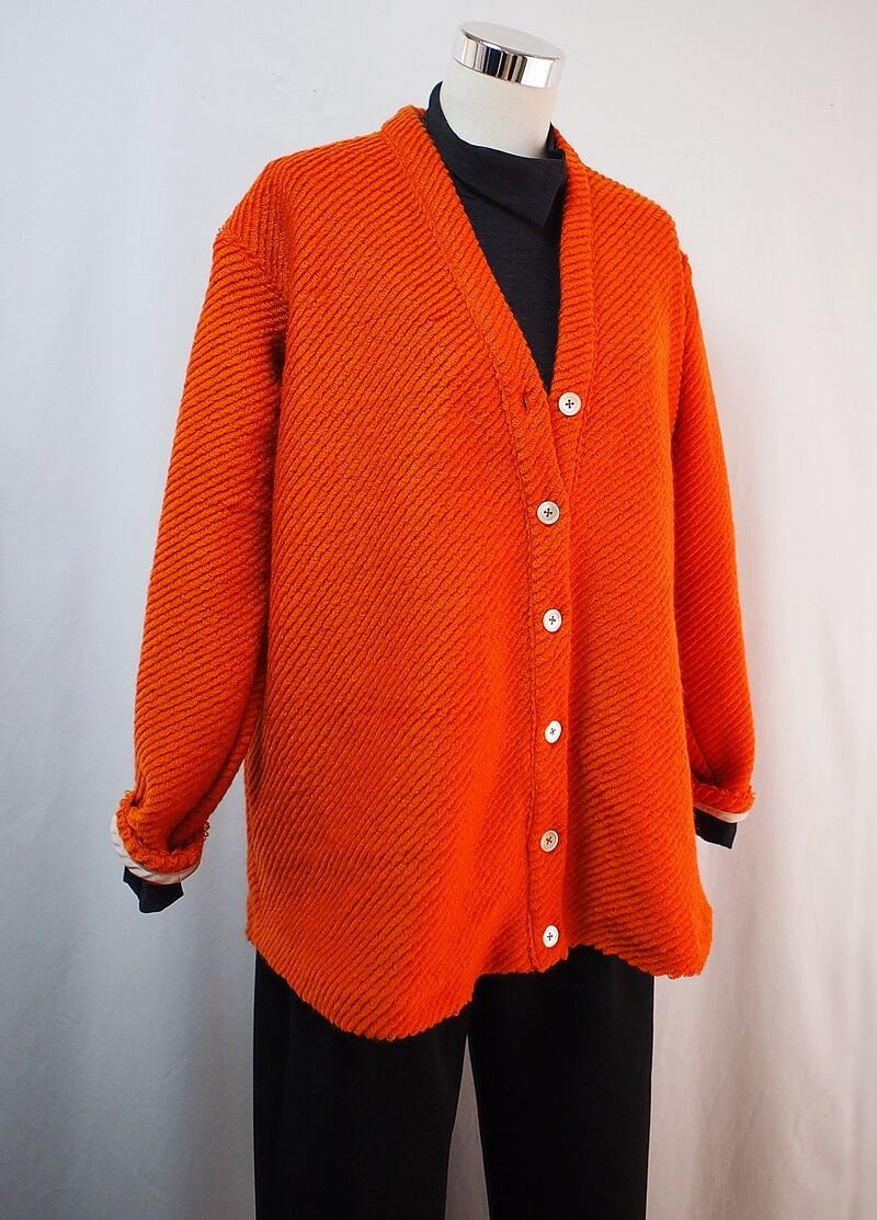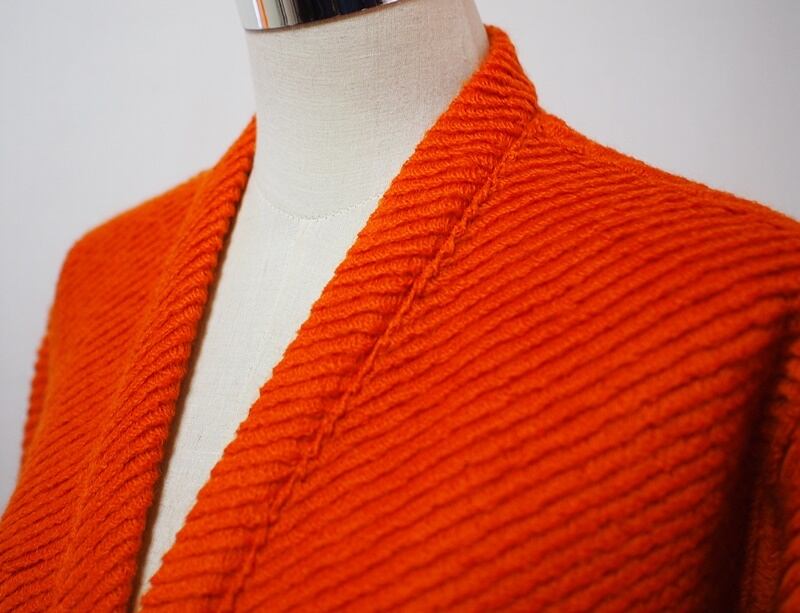 ビビッドなオレンジとハッキリとした斜めの畝が独特で個性的なループニットカルゼで軽い着心地のカーディガンジャケットです。