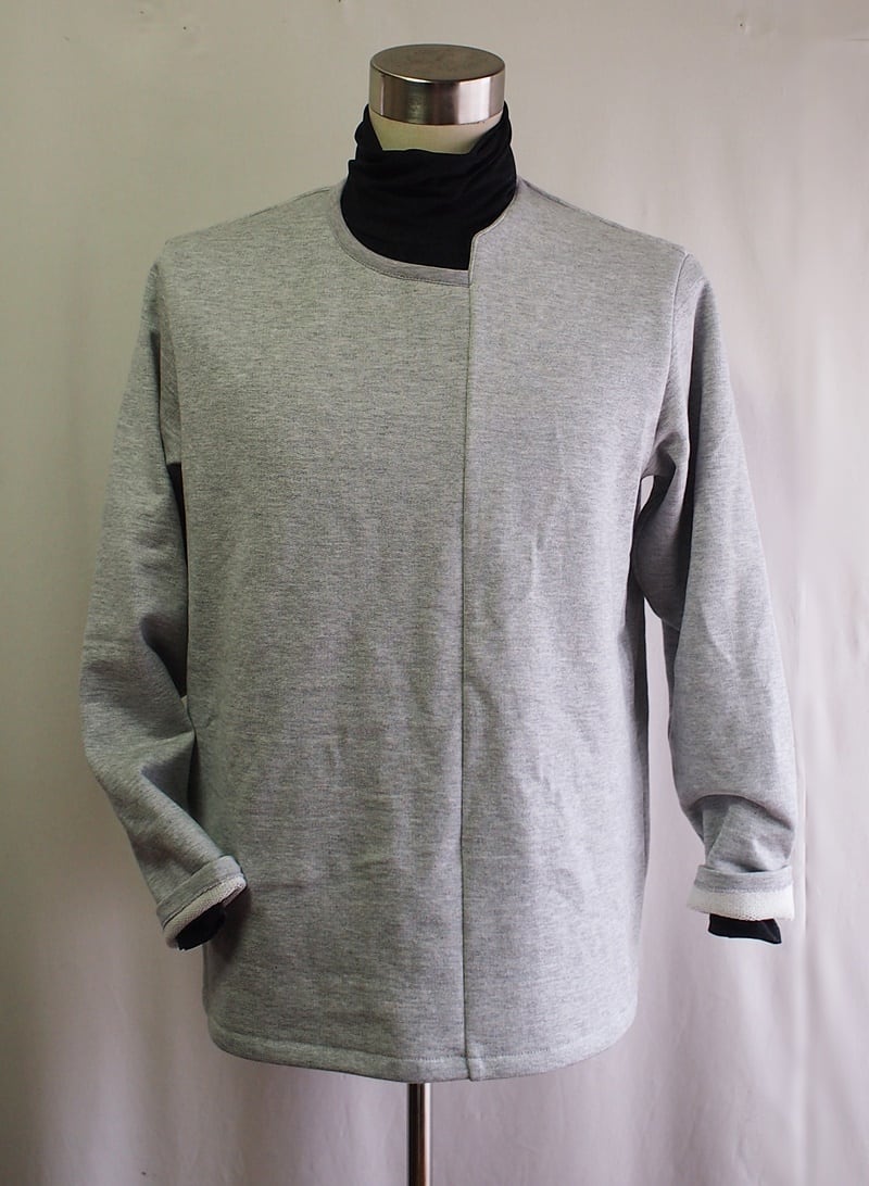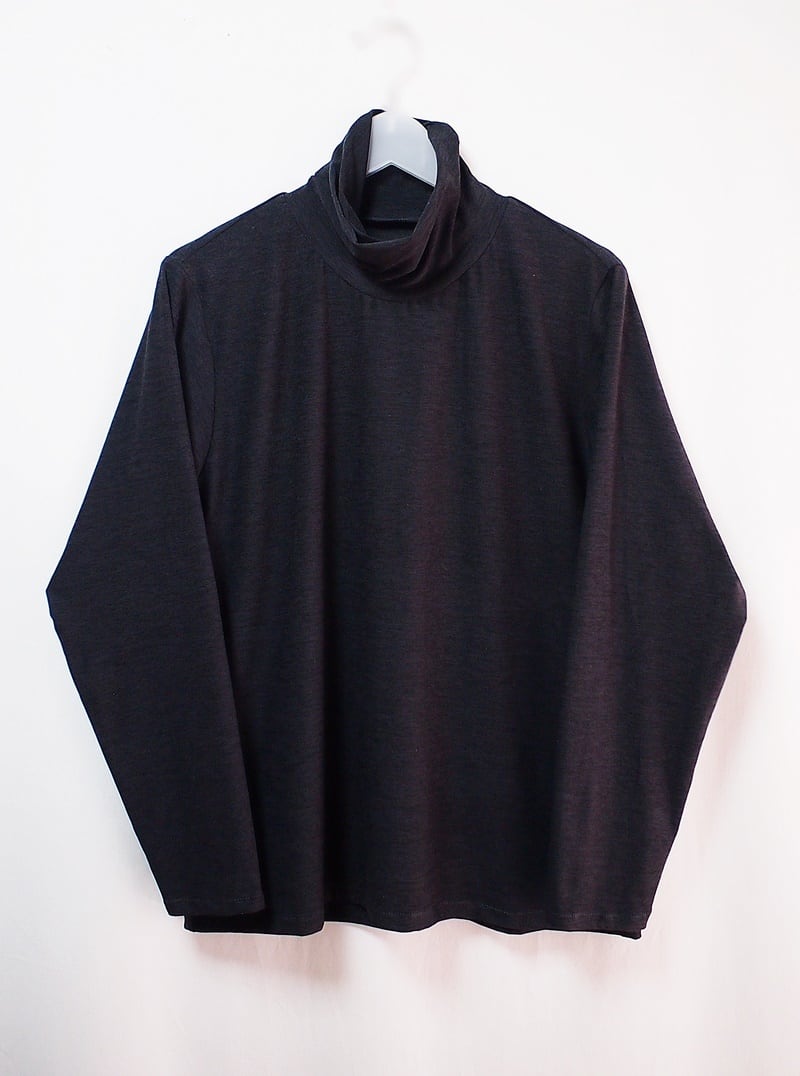 タートルネックの外側と内側を横にずらして衿付け、クシュクシュッと衿にドレープを入れたようなタートルネックTシャツ