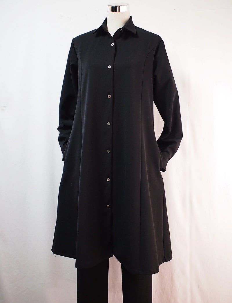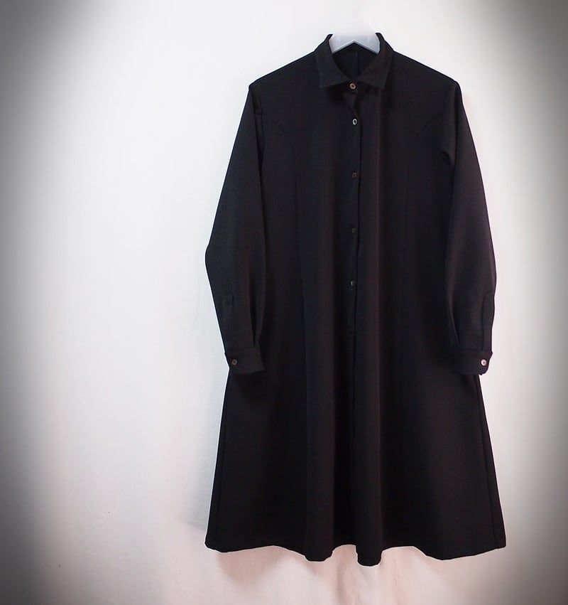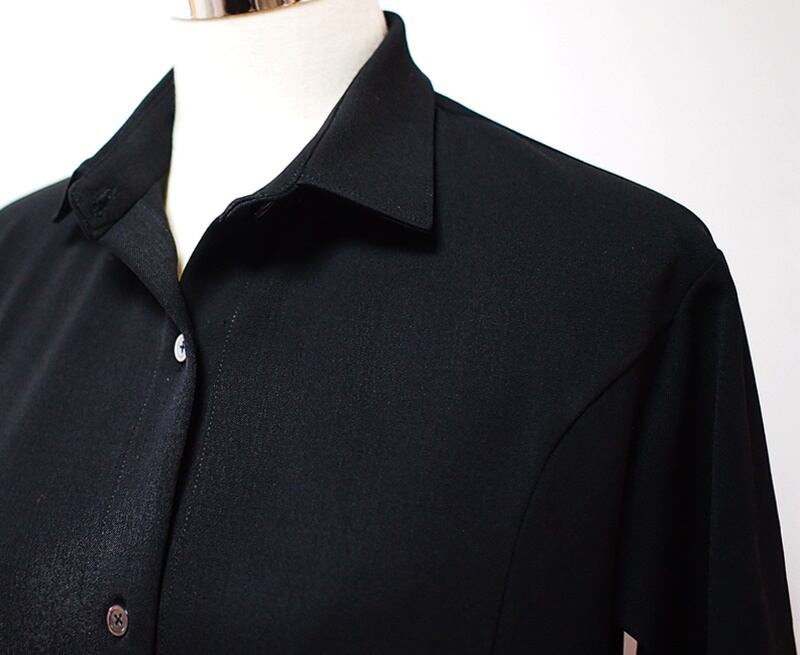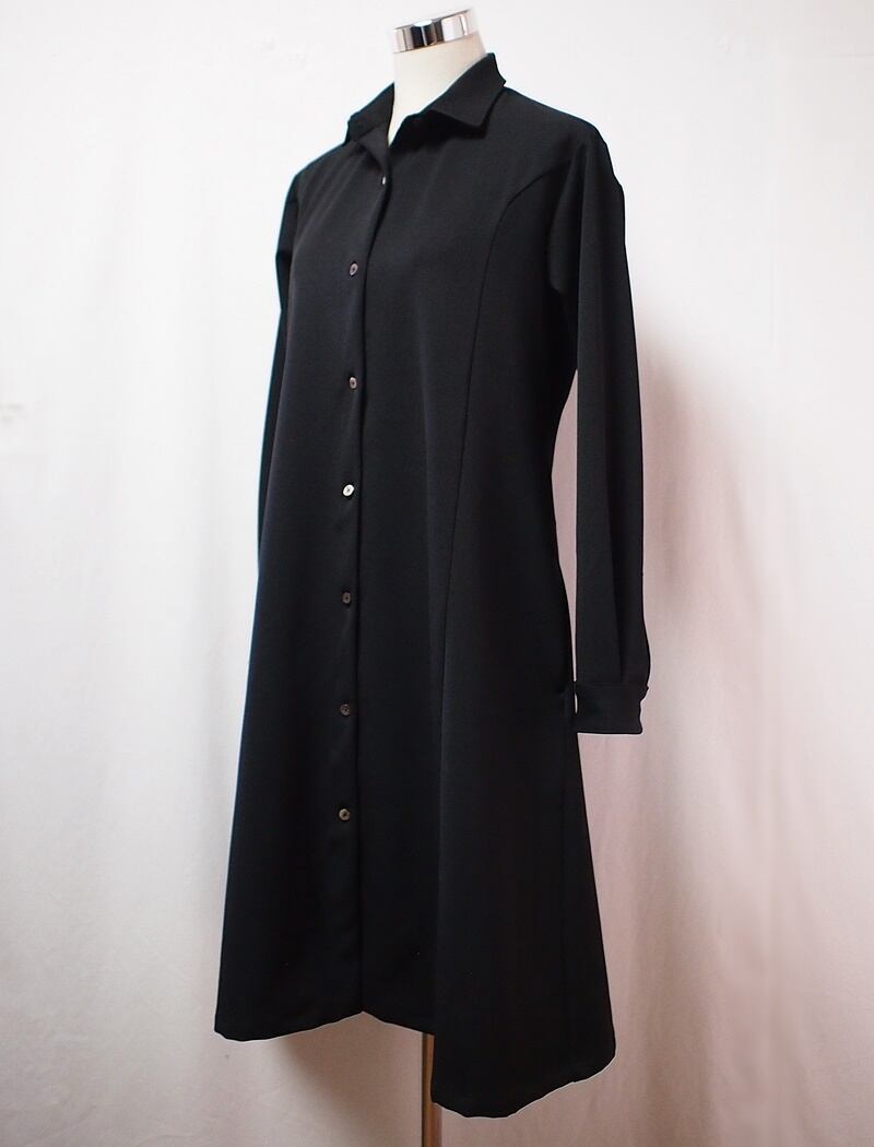 落着きある黒い2WAYストレッチツイルでシーズン長く使えるシャツカラーのパネルラインワンピースです。