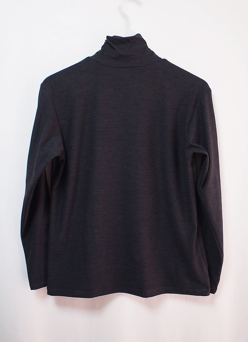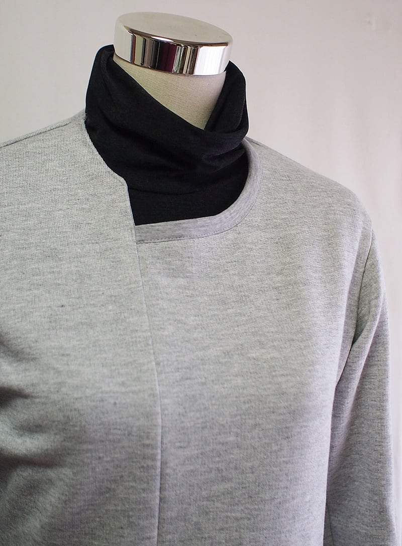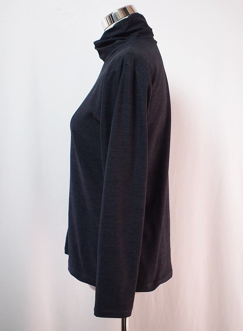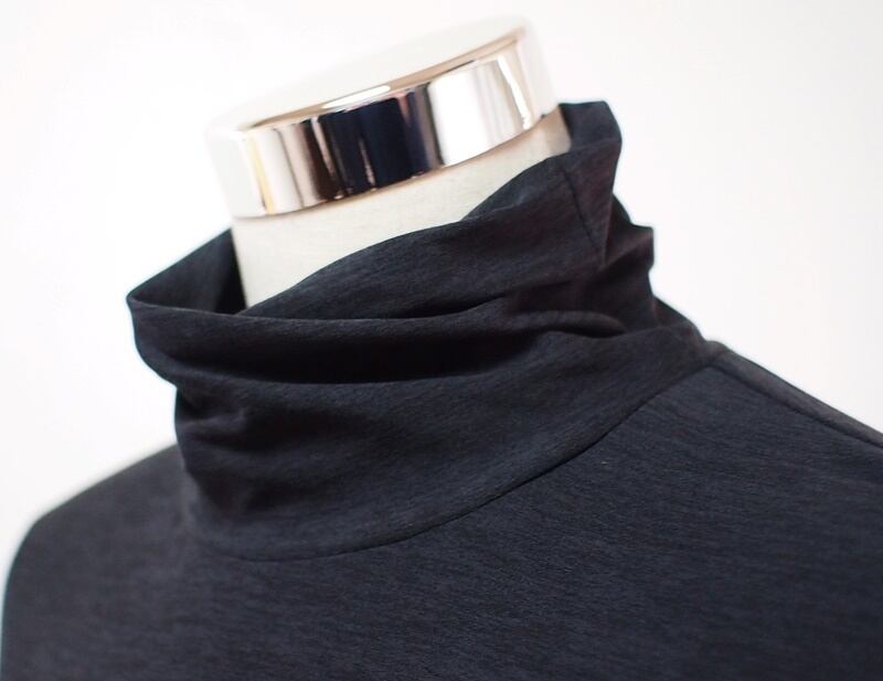 タートルネックの外側と内側を横にずらして衿付け、クシュクシュッと衿にドレープを入れたようなタートルネックTシャツ