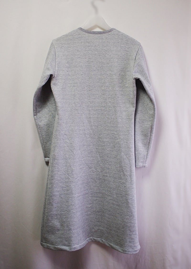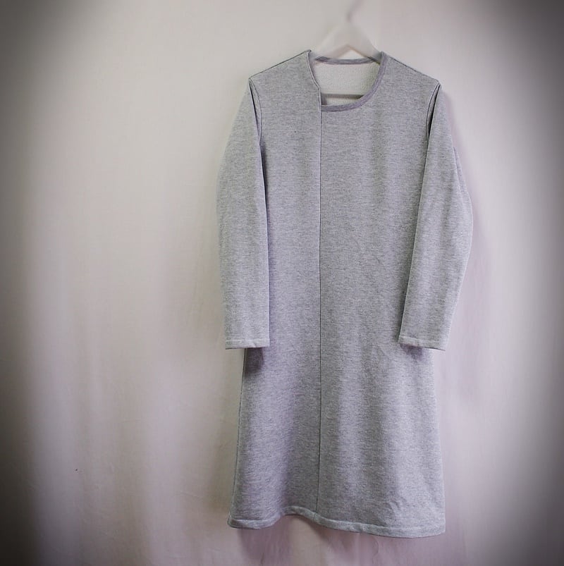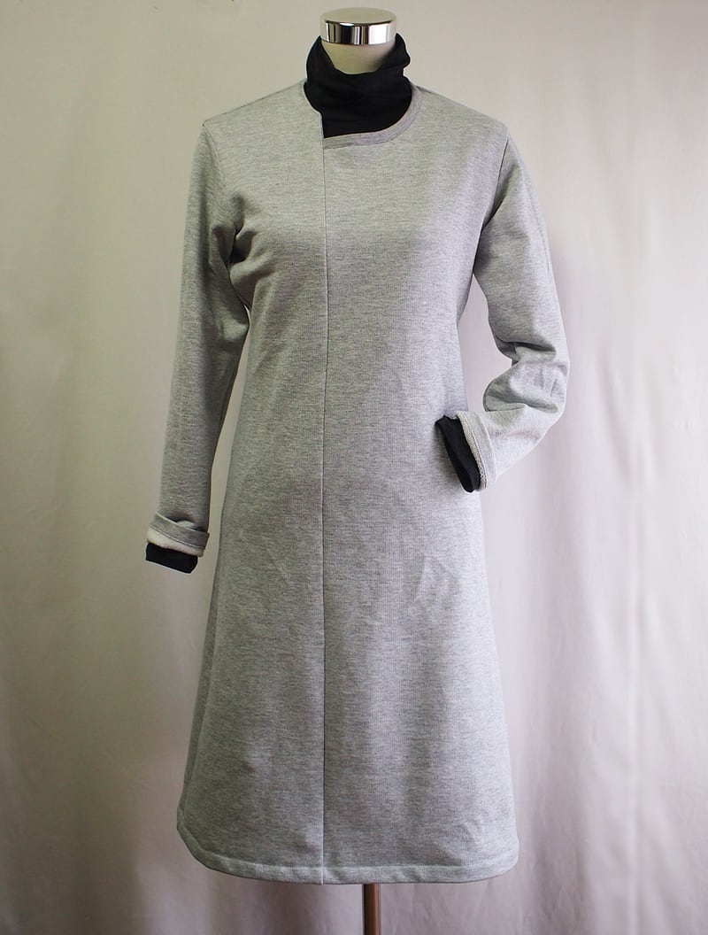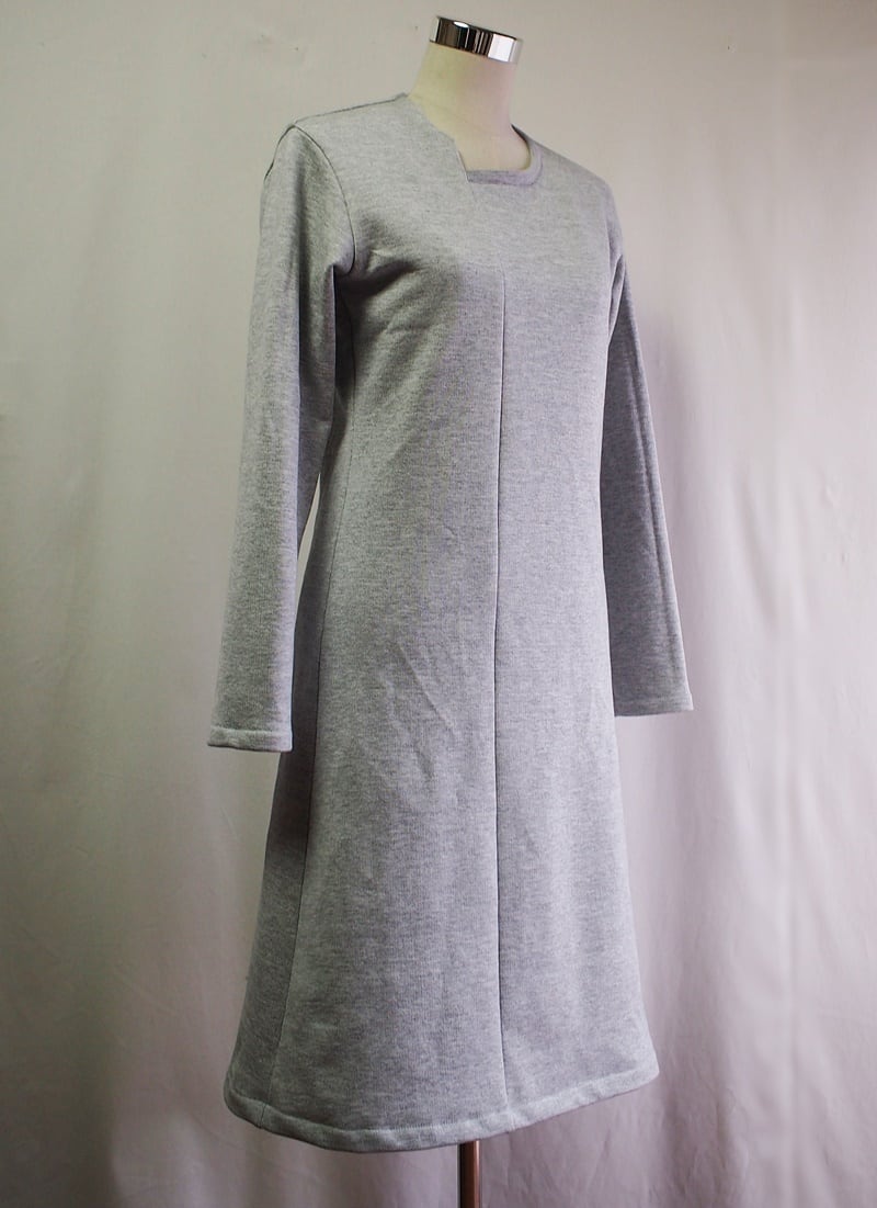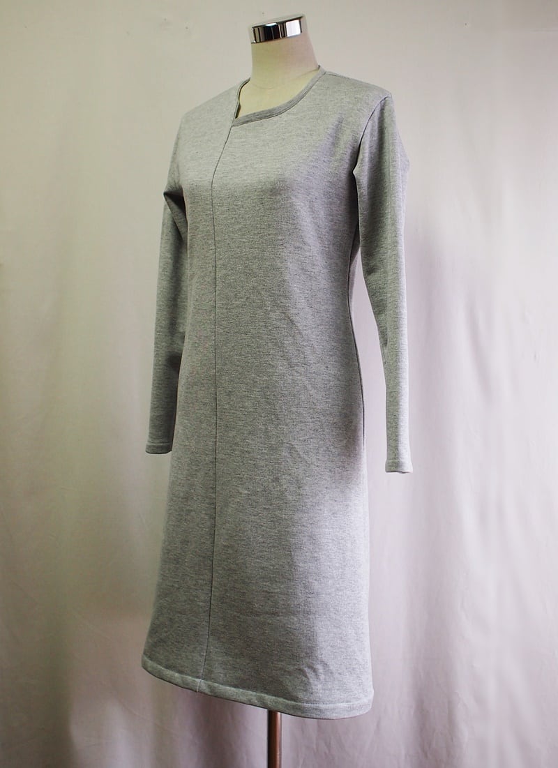 前身頃右寄りに上から裾へ縦のシーム(接ぎ目)を入れ、段違いの衿ぐりでアシンメトリーネックライン、一重仕立てのスウェットワンピース