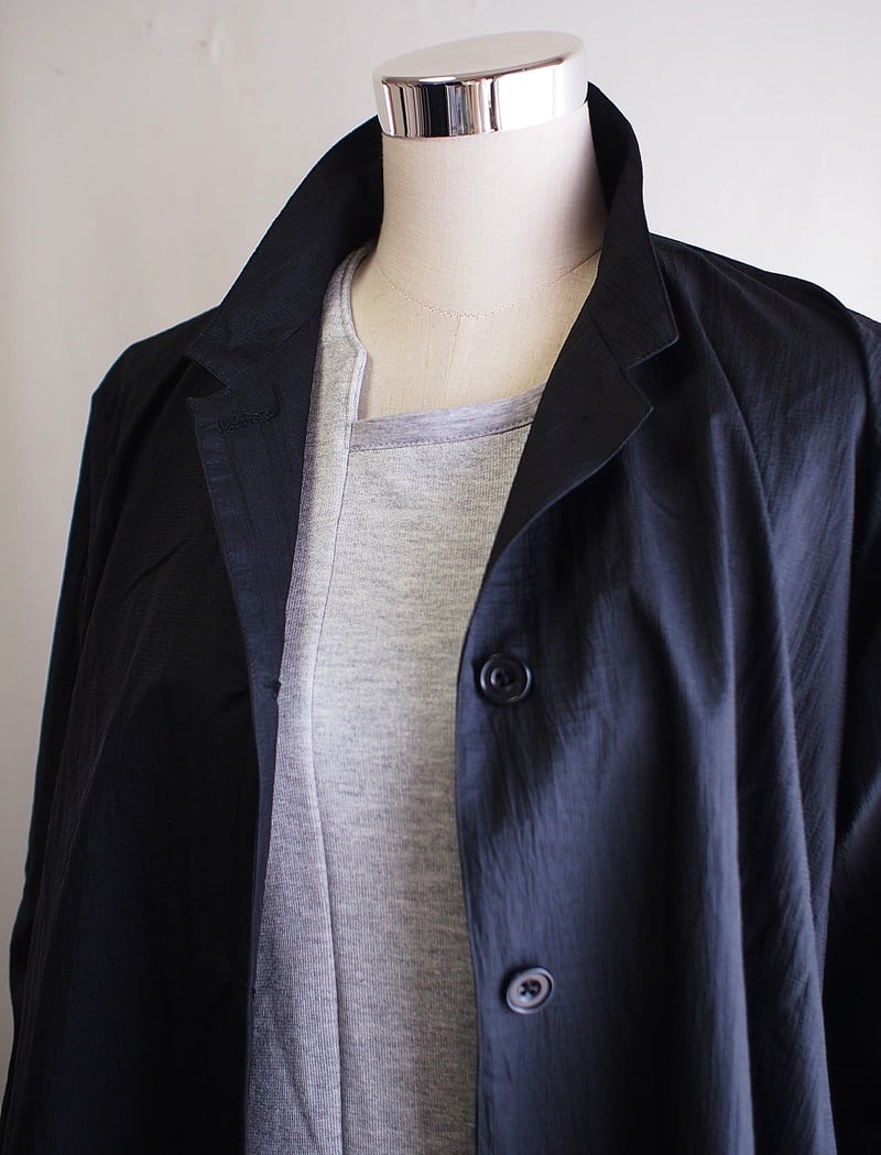 身長160㎝くらいの女性で膝が隠れるくらいの着丈101.5㎝、左右非対称に切り替え分割された身頃は縦にスッキリ