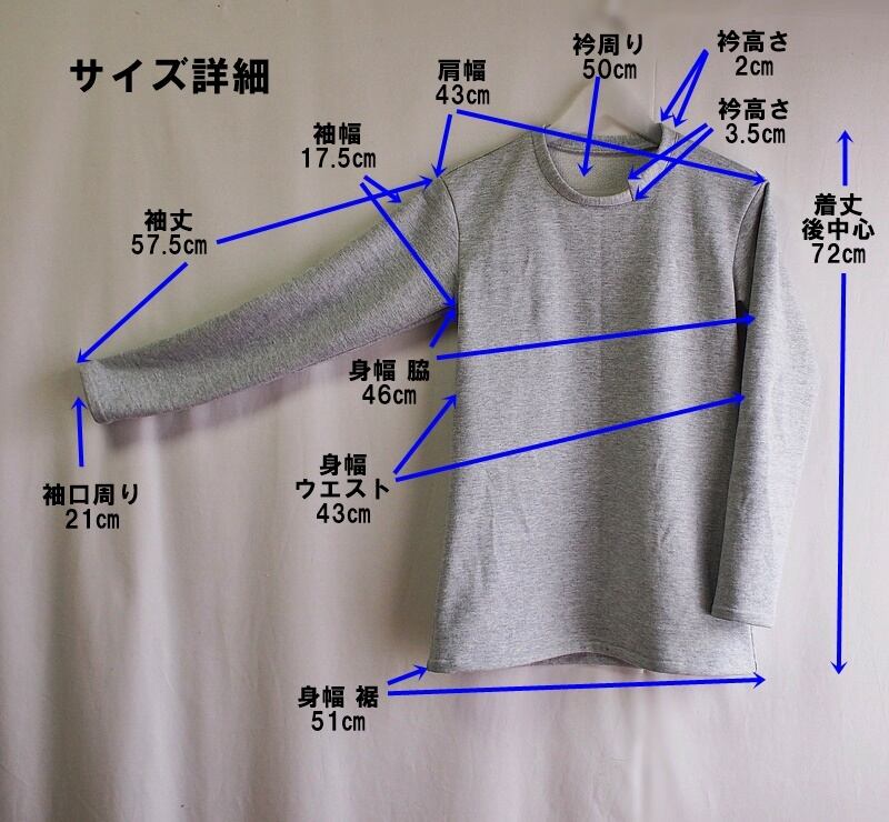 衿付け、袖ぐり、袖下~脇~裾は端ロックして片倒し、袖口と裾周りは端ロックして二つ折りステッチ