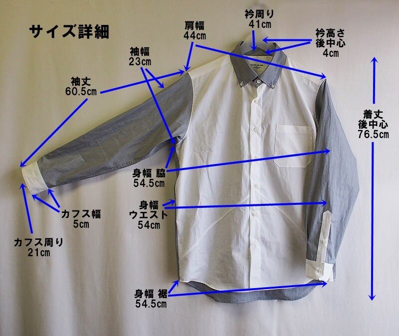 肩幅44㎝、袖丈60.5㎝、コンパクトなショルダーラインのシャツスリーブ、適度なゆとりの袖幅でスッキリみえる袖口ワンタック