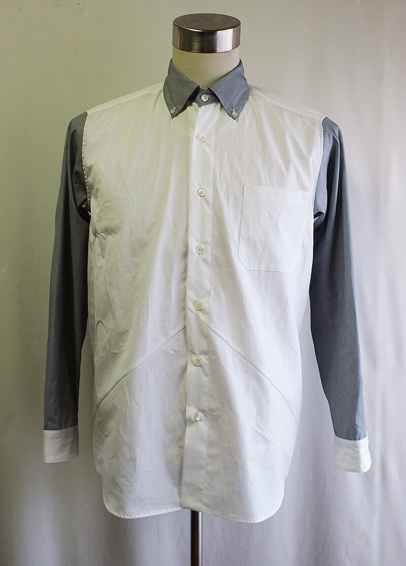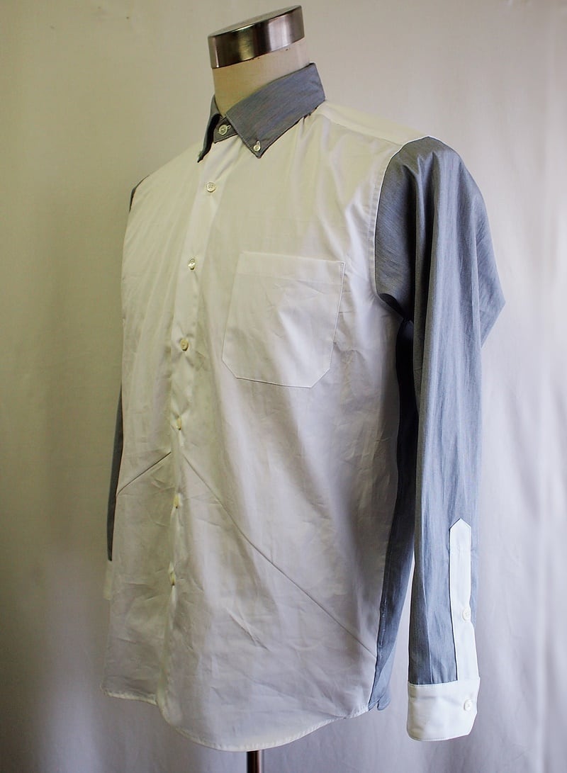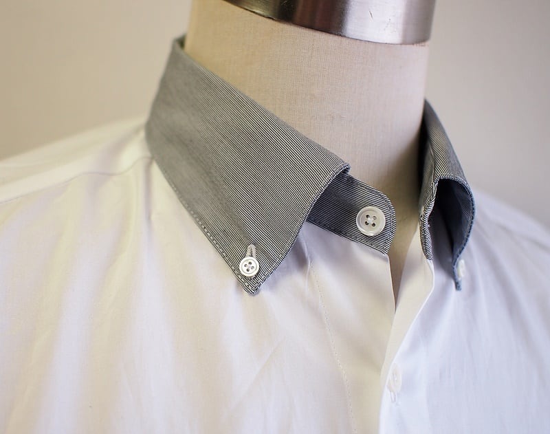 ホワイトとヘアラインストライプ、二つの生地でバイカラーのボタンダウンシャツ