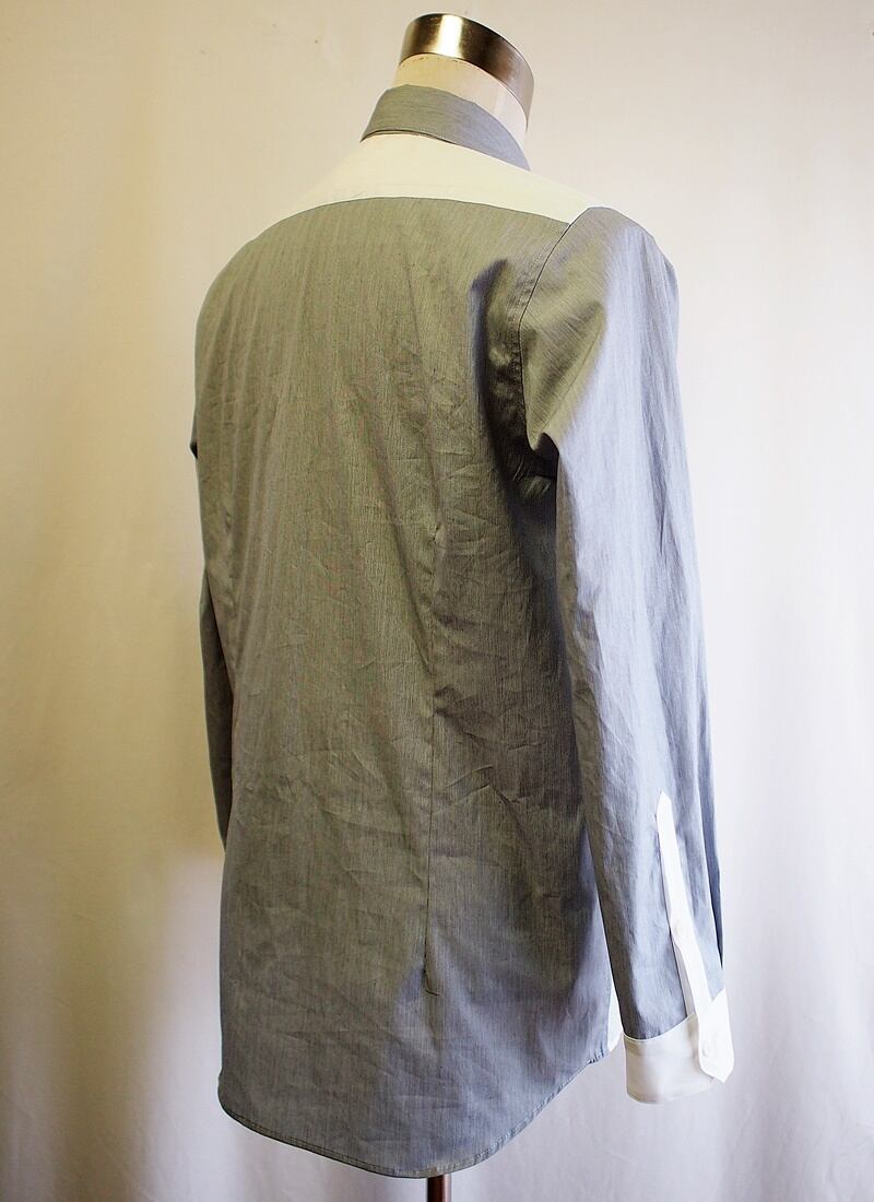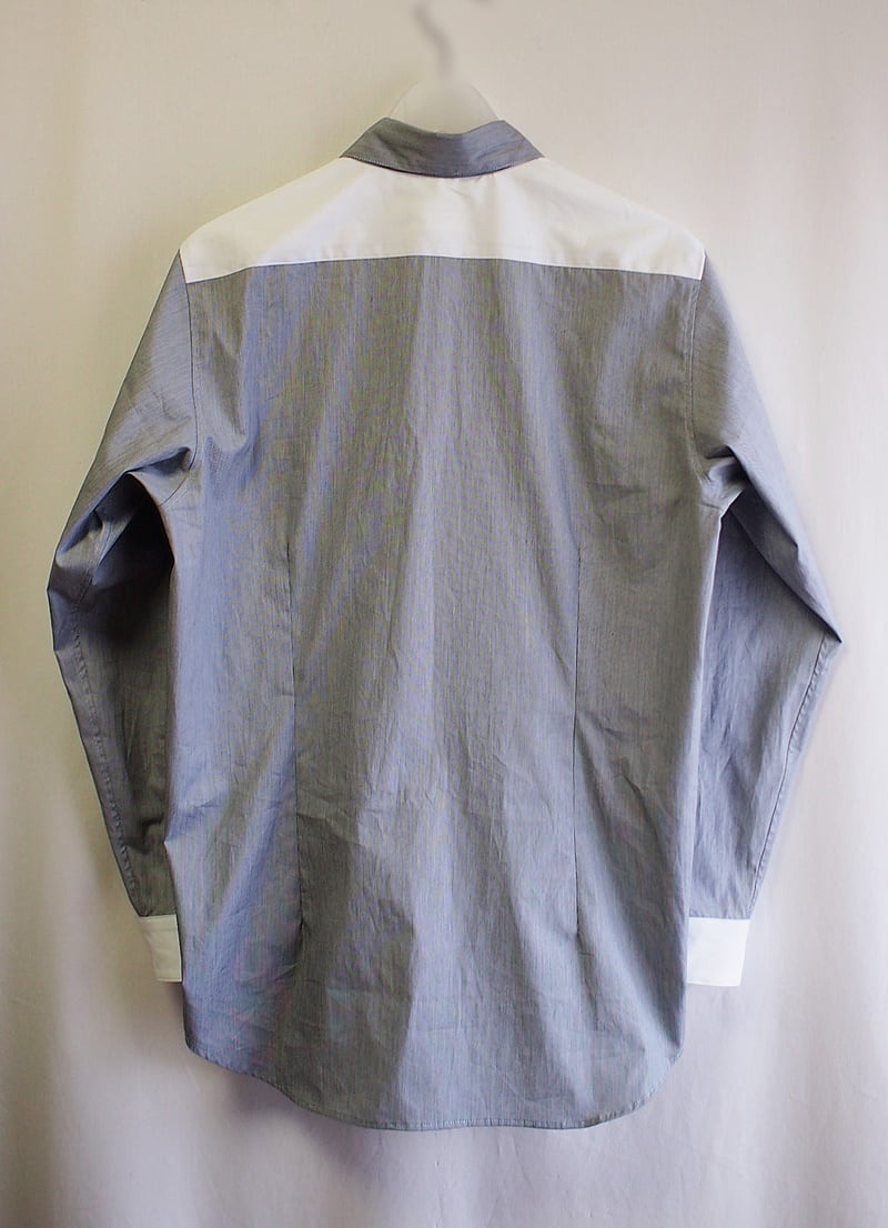後身頃と袖は602ブロードヘアラインストライプを配色、メンズシャツらしい安定感ある肩ヨーク切り替えは真っ白