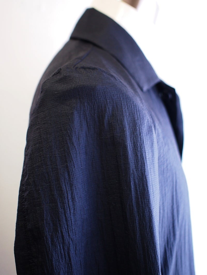 とても薄くて軽くナチュラルなシワ加工の表情が良い素材、混率は綿80%・ポリエステル20%、色合いは光沢を抑えたマットブラック