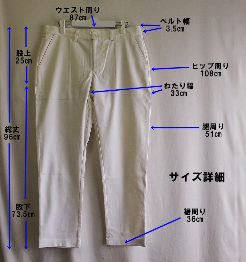 ウエスト周り87㎝、浅めな股上25㎝、程よいフィット感のわたり幅33㎝ヒップ周り108㎝、腿周り51㎝、裾幅18cm