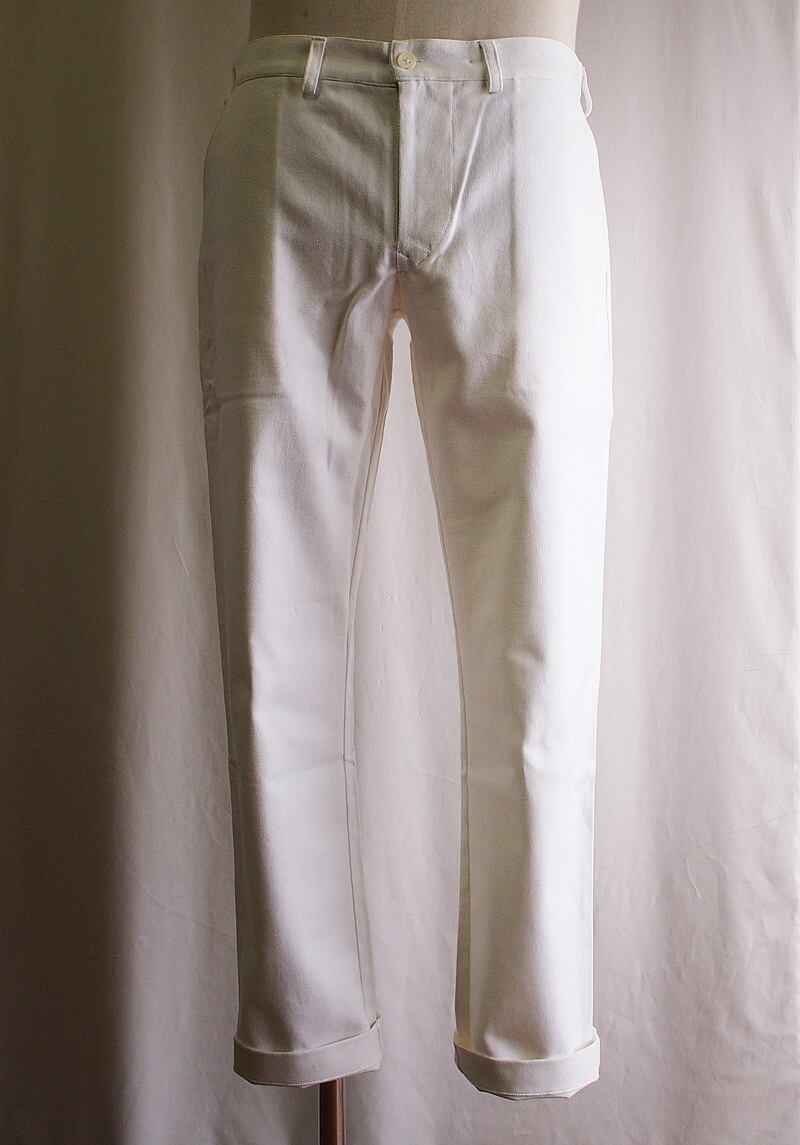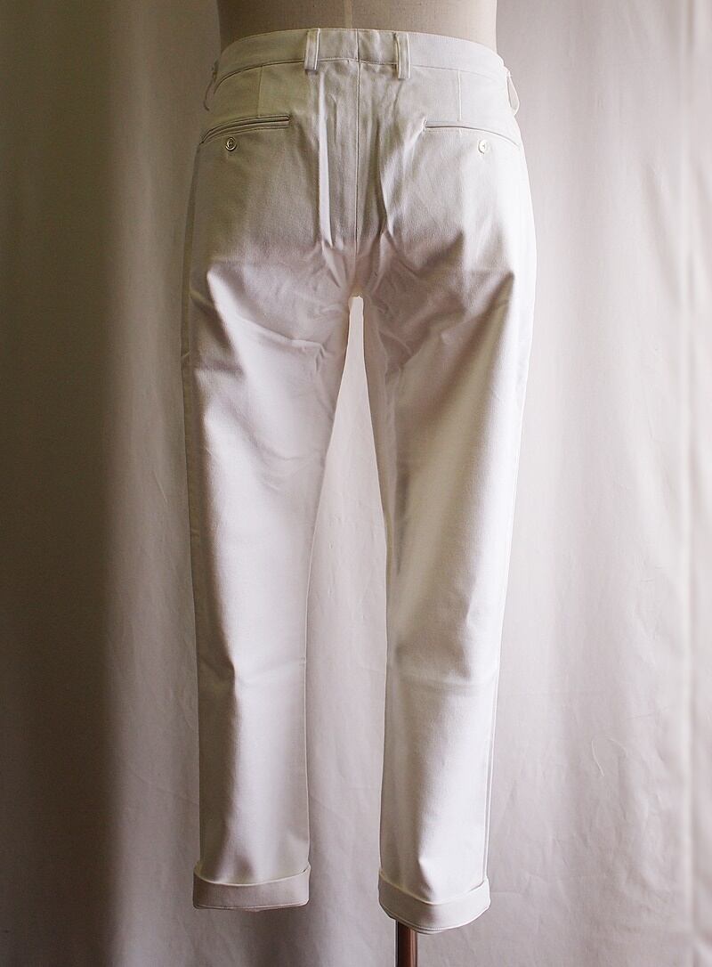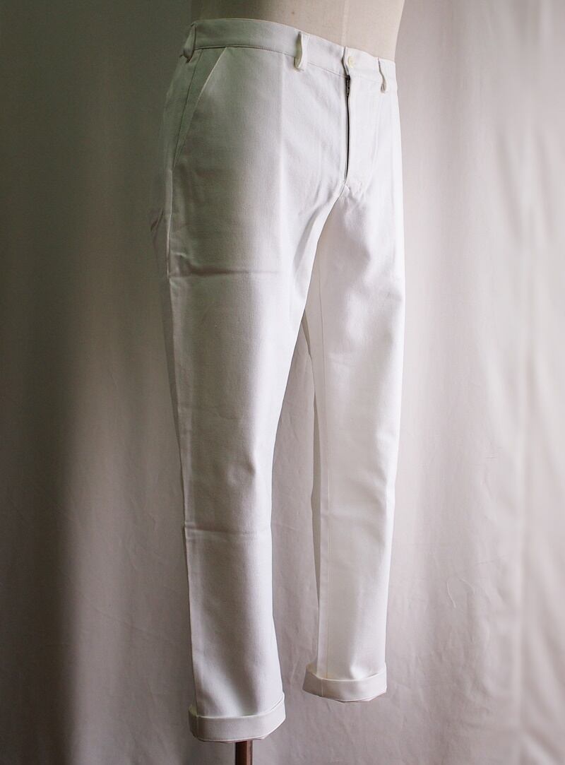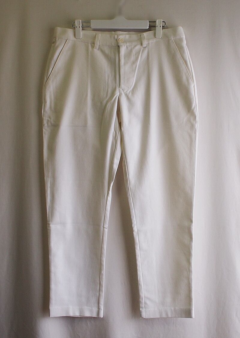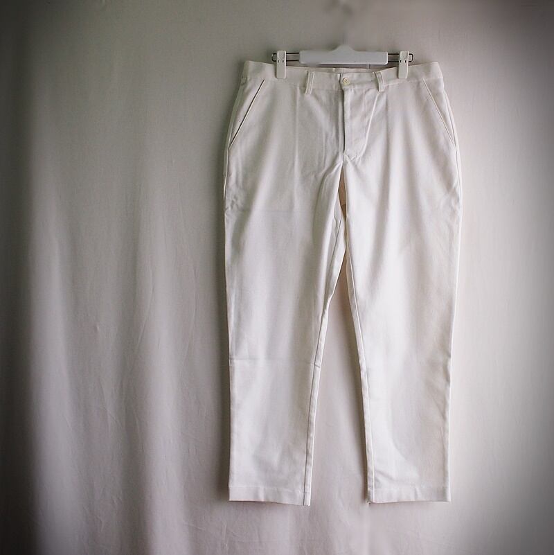 夏向きな白いストレッチ感ある生地でスッキリとしたテーパードパンツ