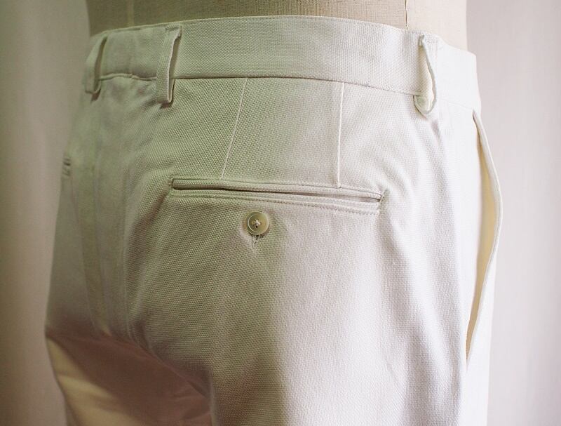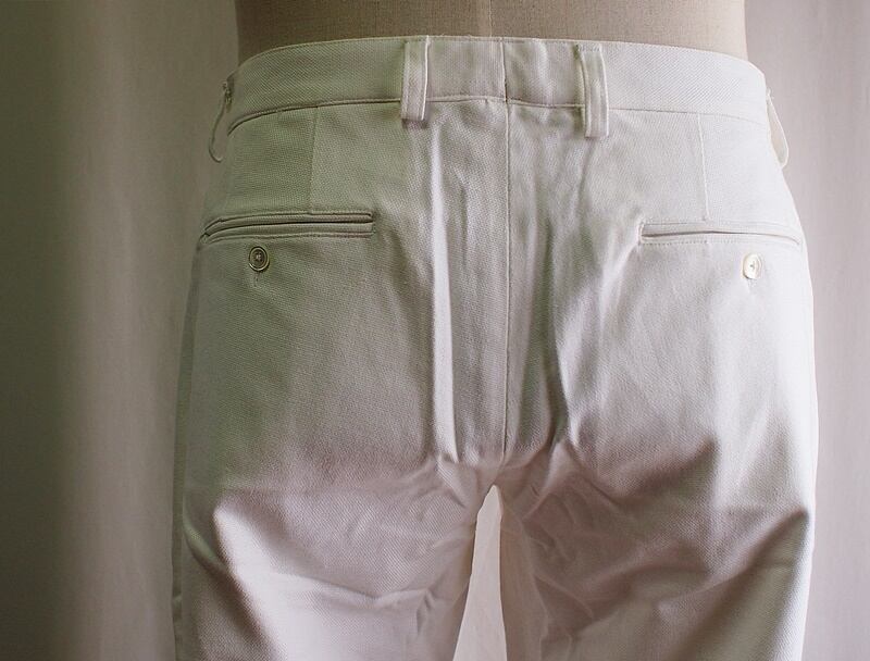 後側は腰上にフィットする2本のダーツ、ボタン留めの両玉縁ポケット、ボタンは全て白の高瀬貝(直径13㎜)を使用