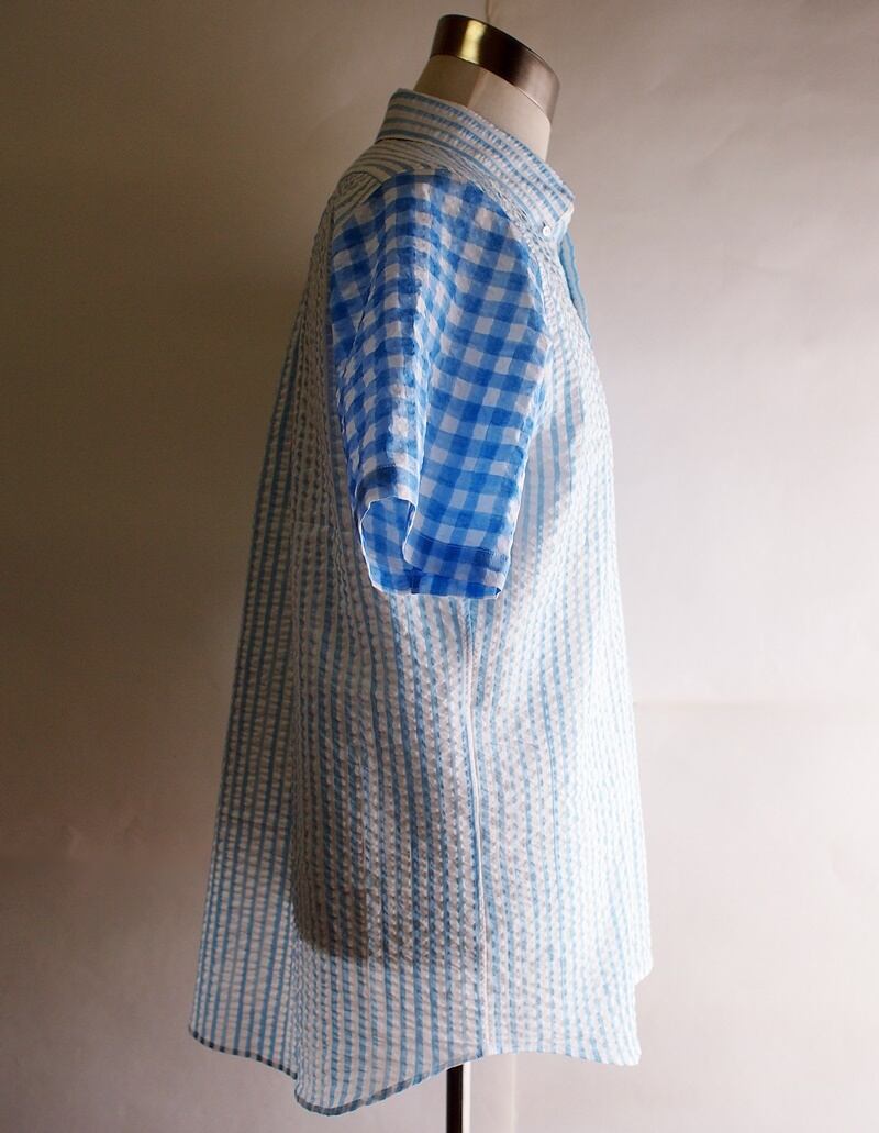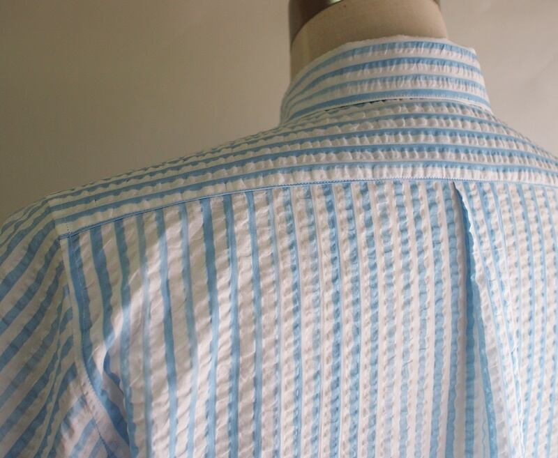 デザインパターンとしては後中心にセンターボックスプリーツ入れたシンプルな半袖のボタンダウンシャツ
