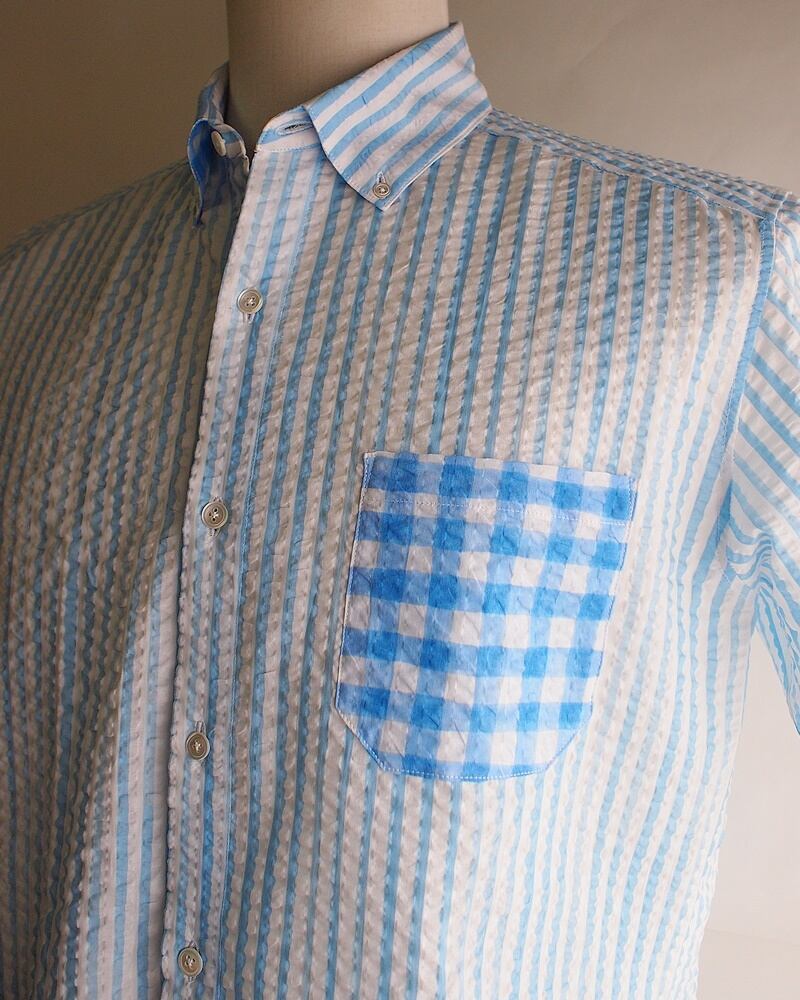 セール70%オフ!たった一つの…メンズ☆ローンリップル☆ストライプ&チェック☆アシメトリー☆ボタンダウンシャツ☆ショートスリーブ☆ホワイト×ブルー☆Lサイズ