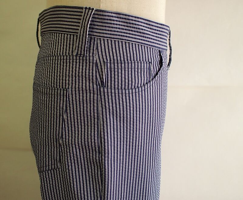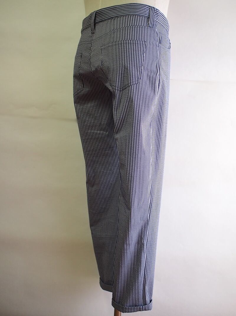 晩夏初秋まで使えるインディゴストライプの5ポケットテーパードパンツ