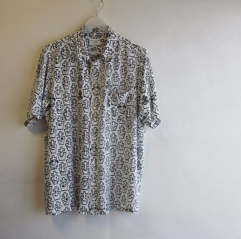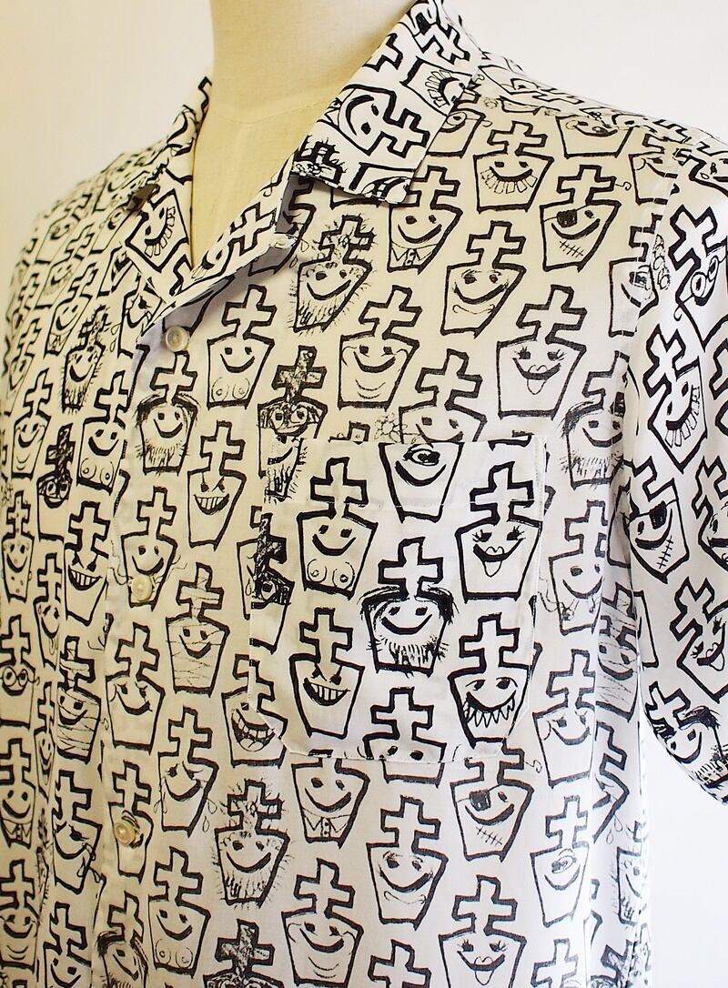セール80%オフ!たった一つの…メンズ☆レーヨンポプリン☆ゴーストプリント☆アシンメトリーパターン☆オープンカラーシャツ☆ショートスリーブ☆Lサイズ☆アイボリー×ブラック