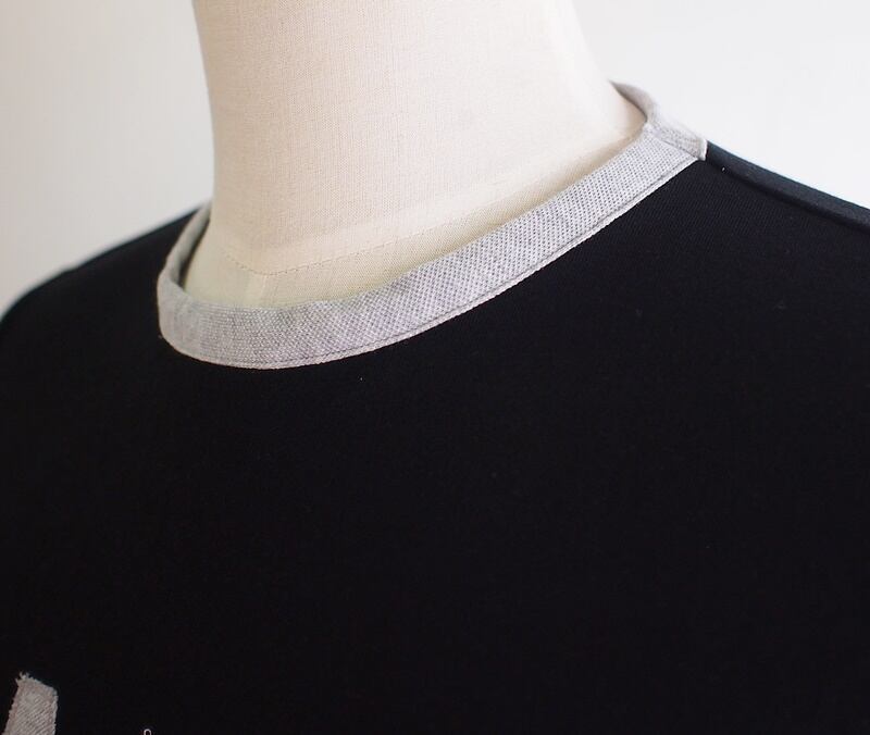 衿ぐりも綿ポリウレタン混のストレッチ鹿の子で挟み込む別布配色バインダー始末