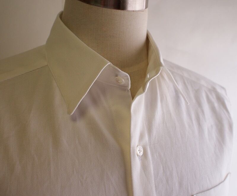 色合いは真っ白ではなくアイボリー、優しく温かみある印象のビジネス向きなレギュラーカラーシャツ
