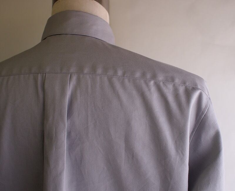 後身頃にはセンターボックスプリーツでゆったりしたシルエット、袖口はボタン止めの剣ボロ、カフス開き