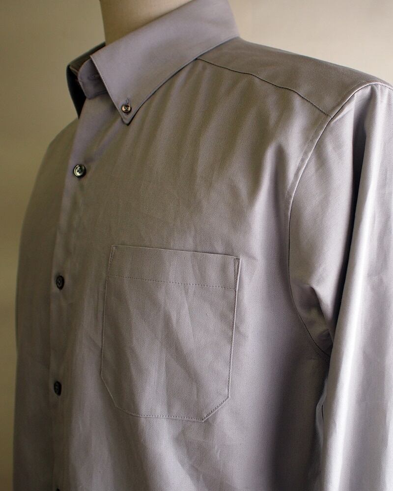 明るいグレーのオックスフォードクロスのオンオフ使えるボタンダウンシャツ
