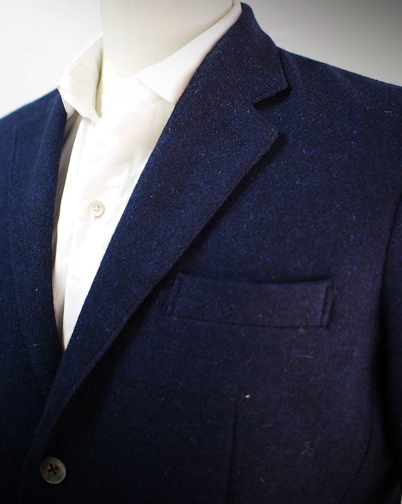 2つボタンでノッチドラペルのテーラード、左胸には箱ポケット、左右腰はフラップ付き両玉縁ポケット