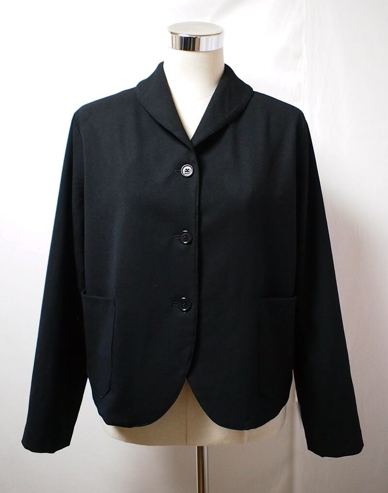 柔らかくて落着きある黒いストレッチウールのスタンドショールカラージャケット
