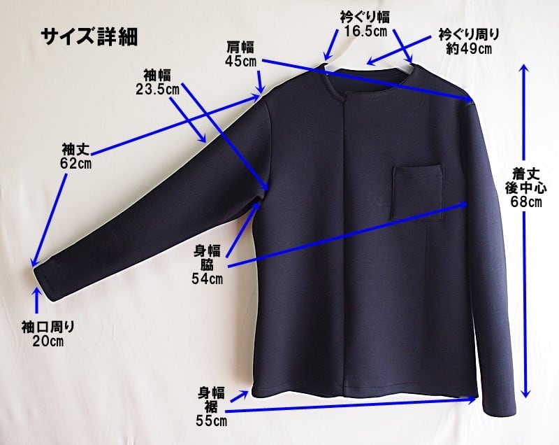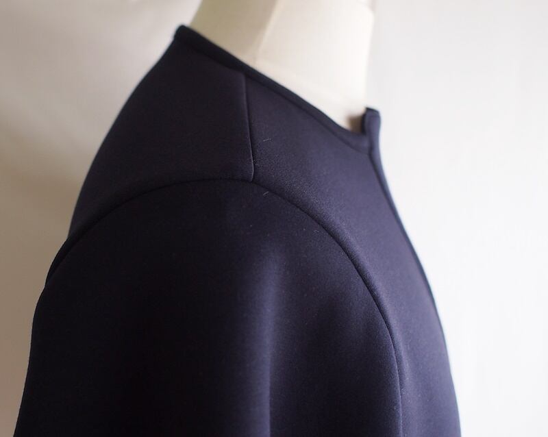前身頃の右側へ縦に切り替えを入れた左右非対称のネックライン、左胸にはパッチポケットを付けました