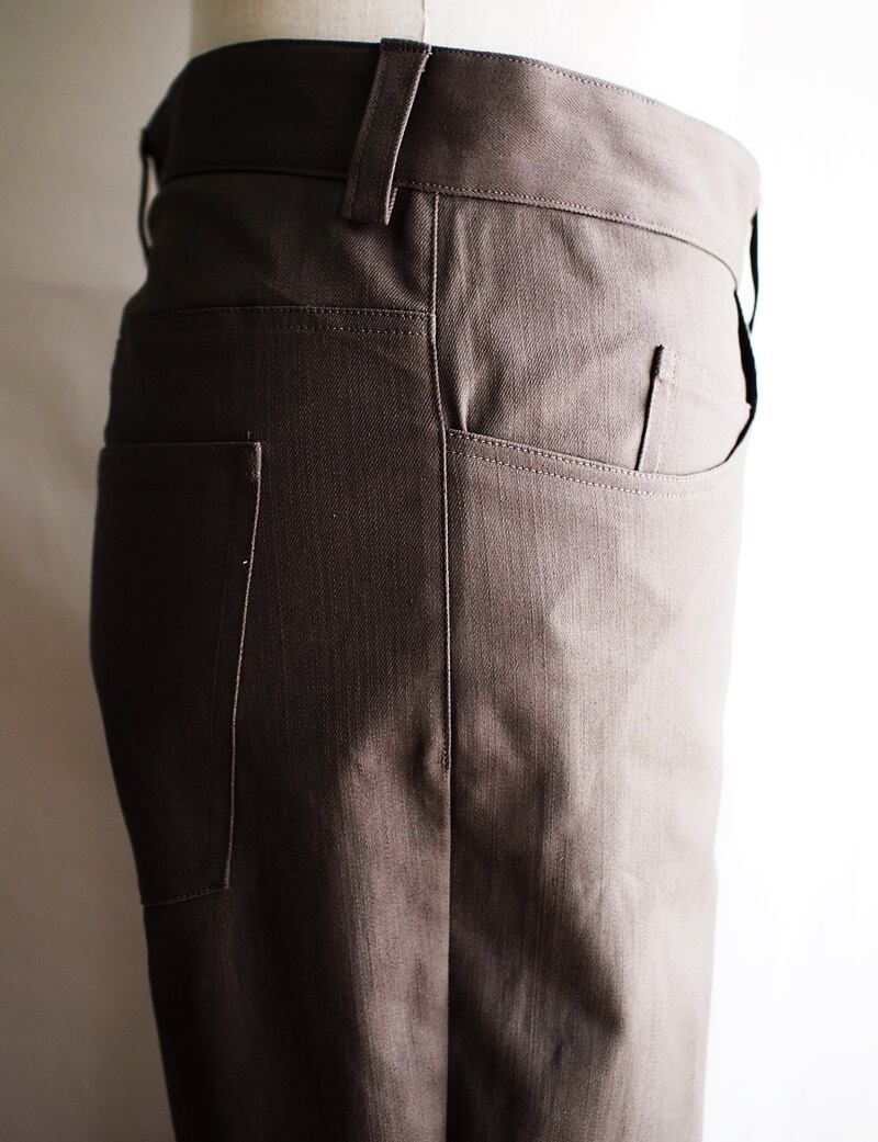 右腰ポケットの中にコインポケット付けて5ポケット、パンツの前側には斜めのシーム(接ぎ目)を膝辺りに2本