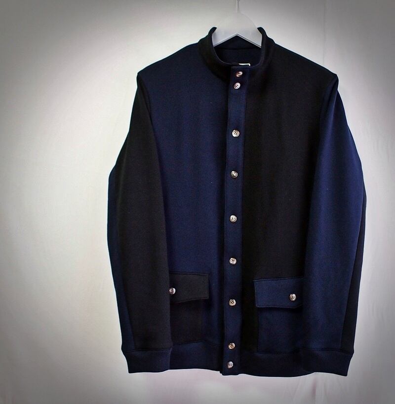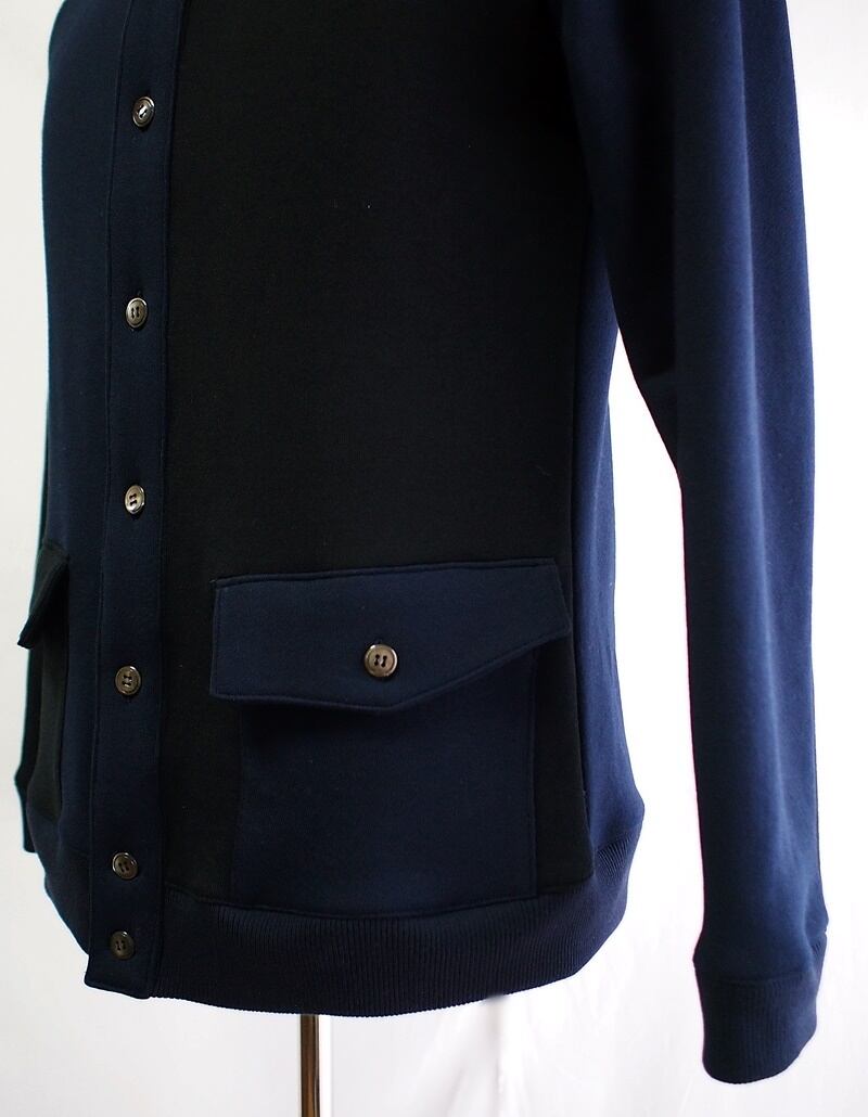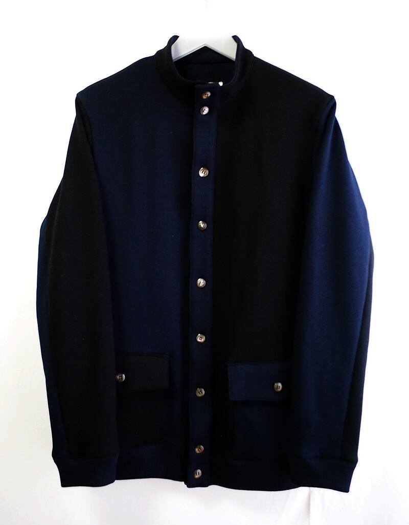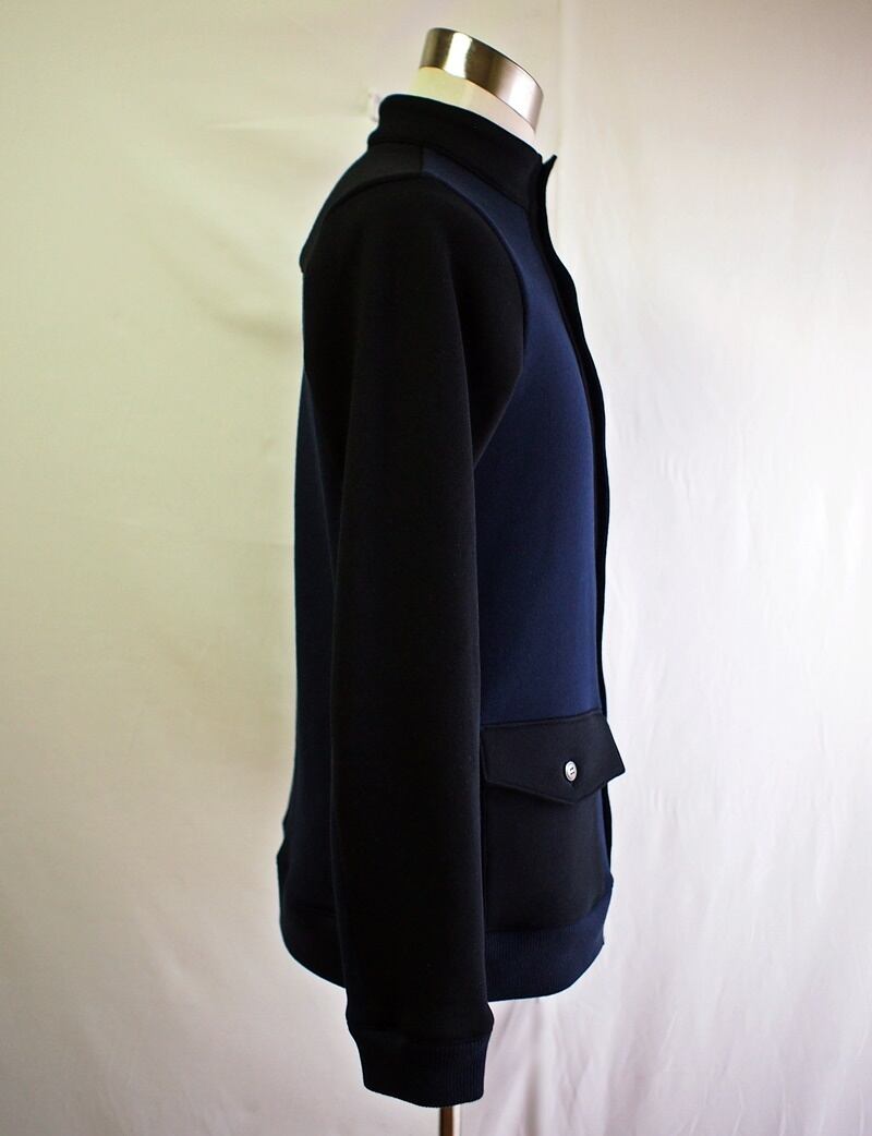 左側の身頃はブラックで外袖とポケットがネイビー、右側の身頃がネイビーで外袖とポケットはブラック