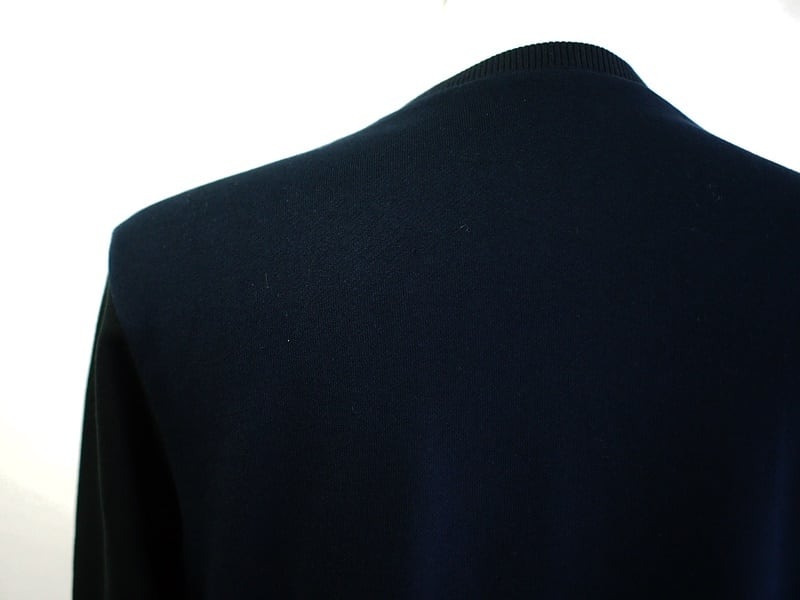 左前からは身頃はネイビーで袖はブラック、右前からは身頃はブラックで袖がネイビー、後身頃はネイビー