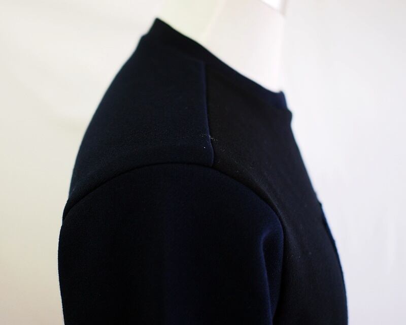 綿100%のミニ裏毛、ネイビーとブラック2色で左右の袖と前身頃をアシンメトリーに切り替えたクレイジーパターン