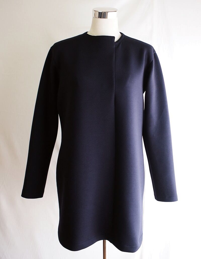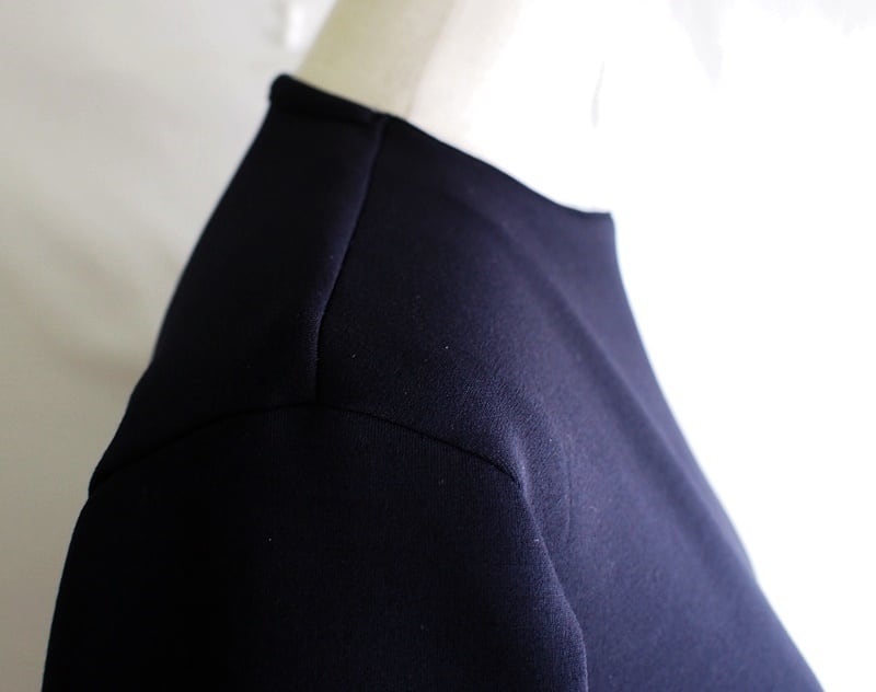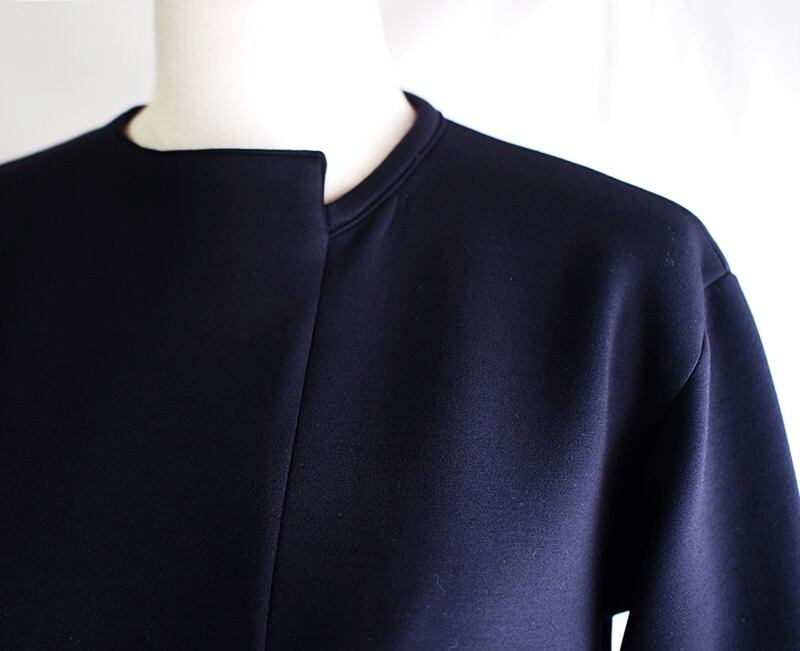 前身頃左寄りへ縦に切り替えを入れたアシメトリーネック、右側からの衿ぐりは左途中で直角に曲がり、上から下へ縦にシーム(接ぎ目)