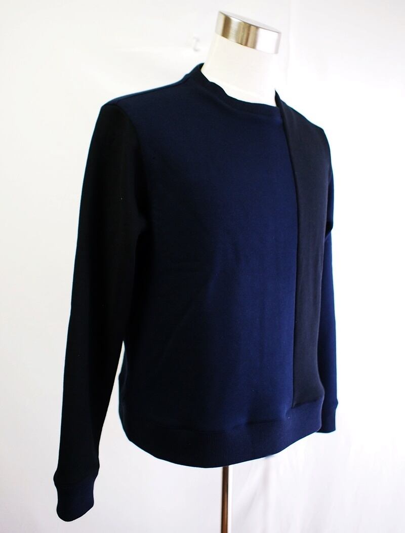 綿100%のミニ裏毛、ネイビーとブラック2色で左右の袖と前身頃をアシンメトリーに切り替えたクレイジーパターン