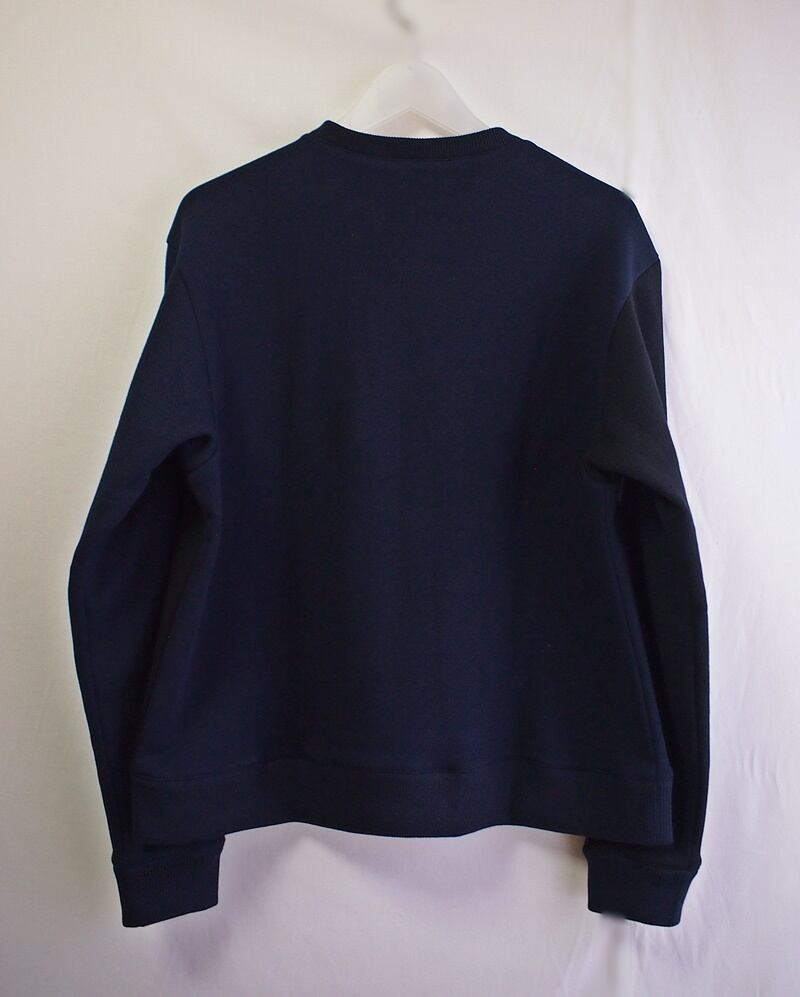 後身頃はネイビーでシンプルなクレイジーパターン、袖口、裾のリブ編み素材は締め付けを弱くしていてロンT感覚のプルオーバースウェット