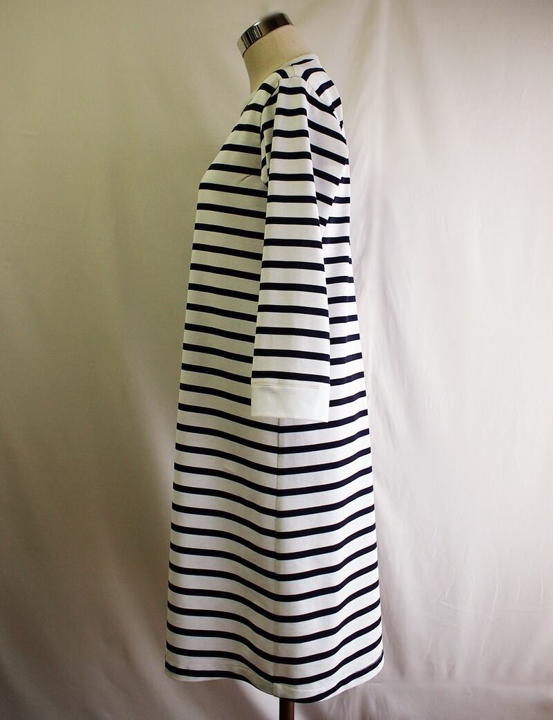 比較的薄手ですが透ける心配のない緻密に編まれた上質で高級感あるウルティマ引き揃えボーダー天竺のアシンメトリーネック Aラインワンピースです。