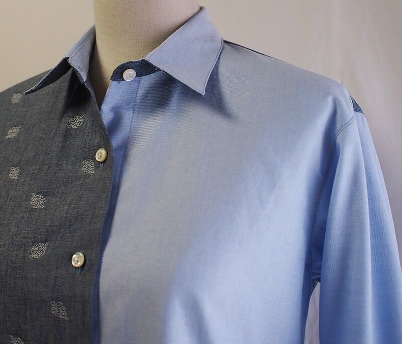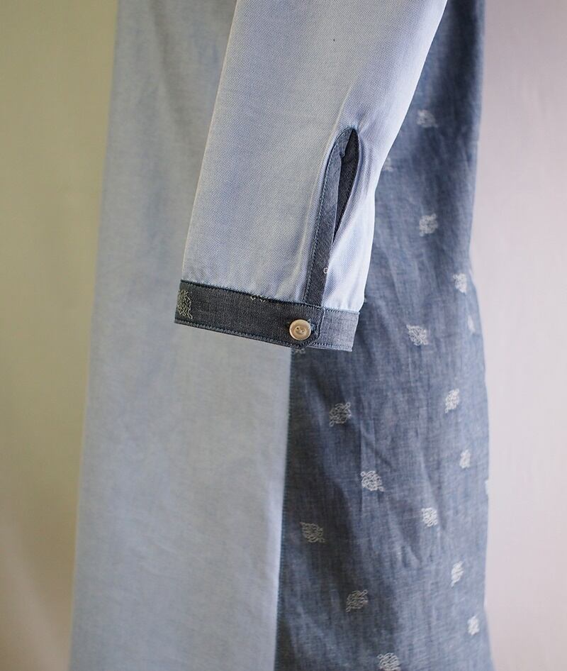 衿表はサックスブルーの無地ダンガリーがメインで衿裏はジャガードダンガリー