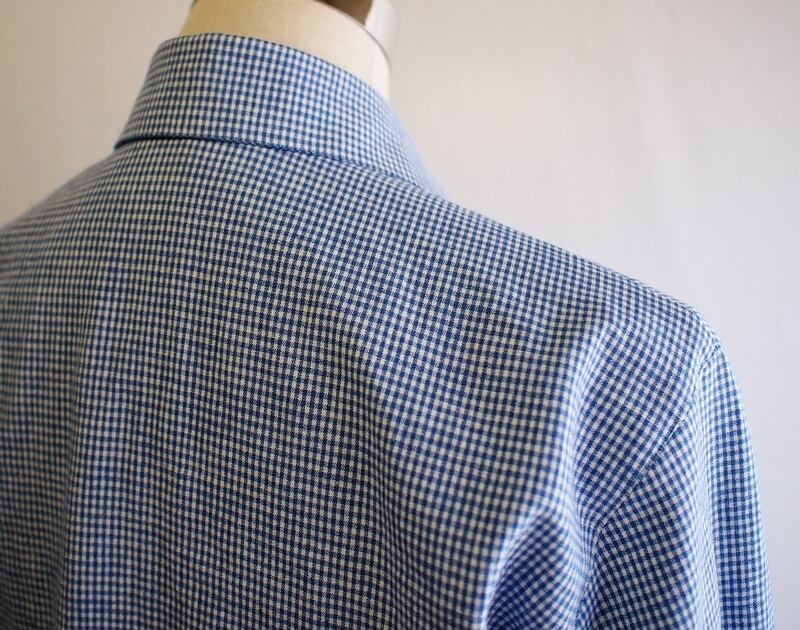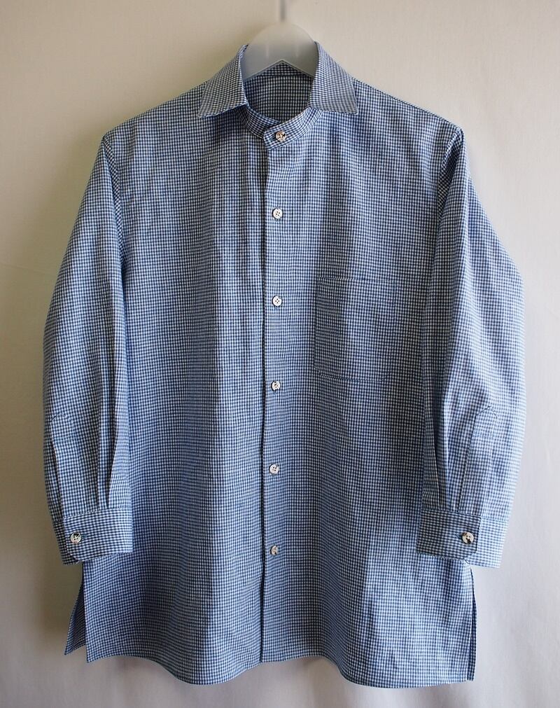 使用した生地は麻55%・綿45%の平織り素材で明るいブルー系と白の細かなギンガムチェック