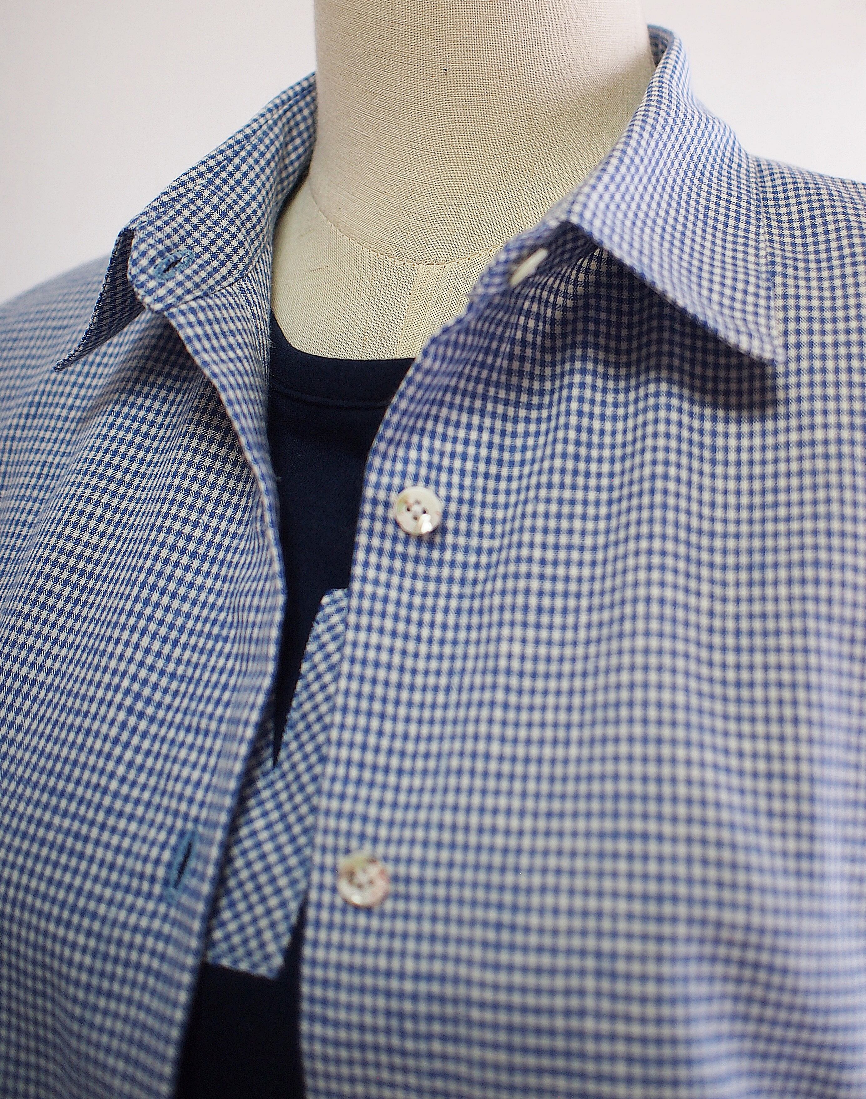 衿ぐりは共布で挟み込むバインダー始末、袖ぐりと裾の始末は端ロックして折り返しステッチ
