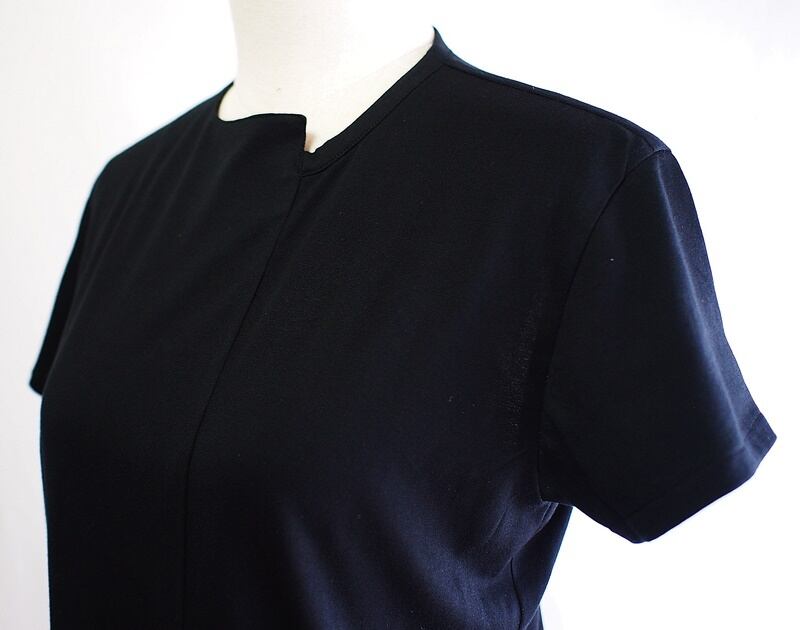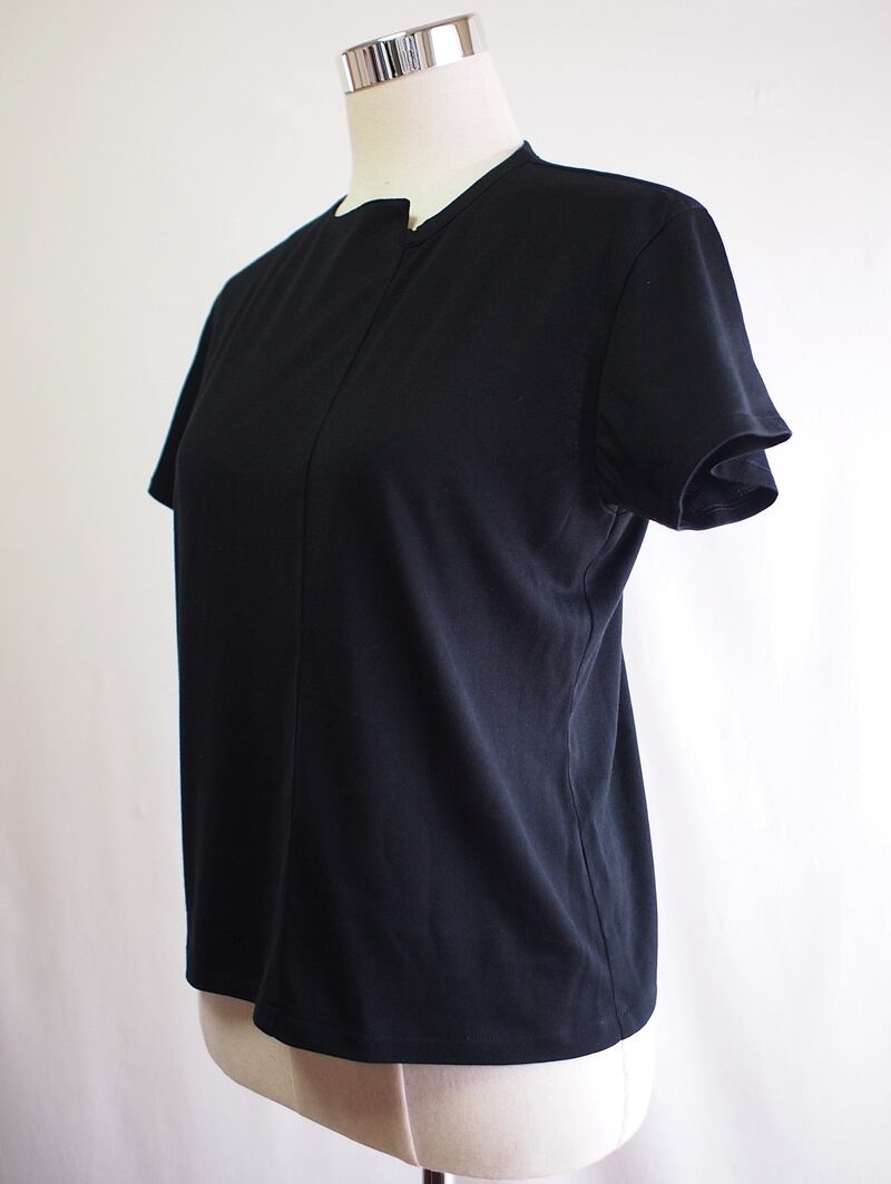 クルーネックの前身頃左寄りに上から裾へ縦のシーム(接ぎ目)でスッキリと身頃も左右非対称に切り替え