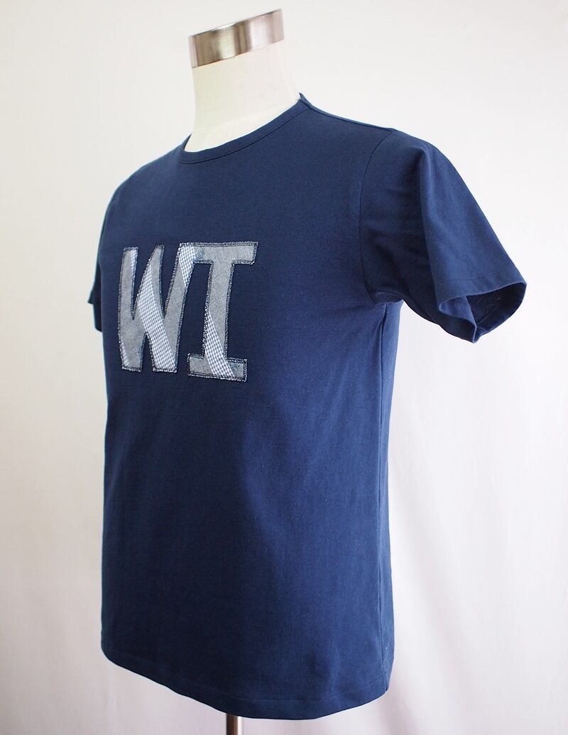 前中心へパッチワークWIロゴをアップリケしたクルーネックの半袖Tシャツ