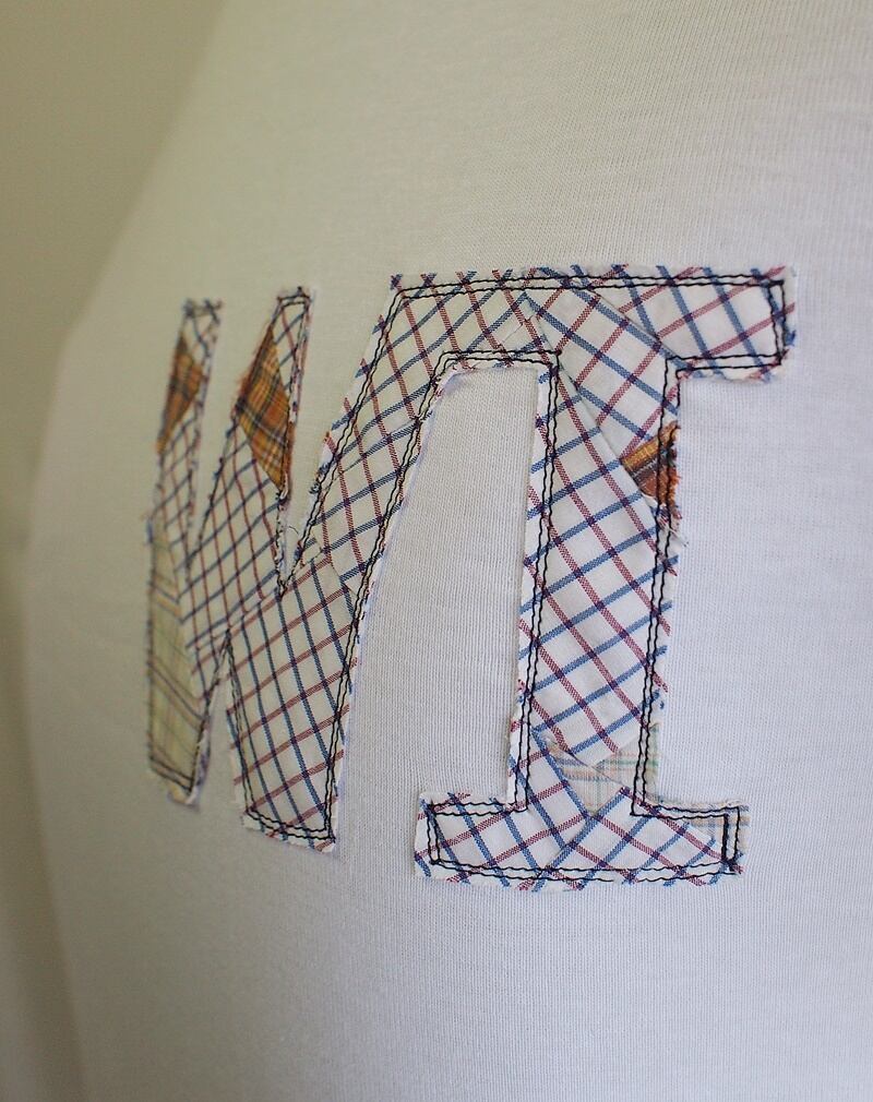 3種類の綿チェック生地をランダムにパッチワークしてからWIロゴをいつもよりも少し小さめにカット、生地端は裁ち切りのまま二重にミシンステッチしてアップリケ