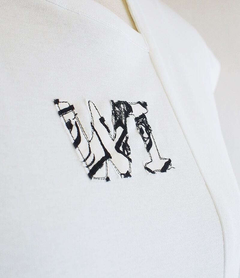 WIロゴをアップリケしたアシンメトリーネックのフレンチスリーブT