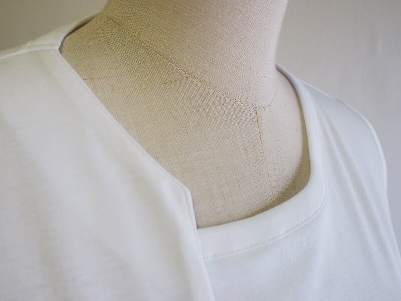 後側から左、右前衿ぐりの途中まで共布バインダーで挟み込み、前側衿ぐりが段違いになるアシンメトリーネックライン