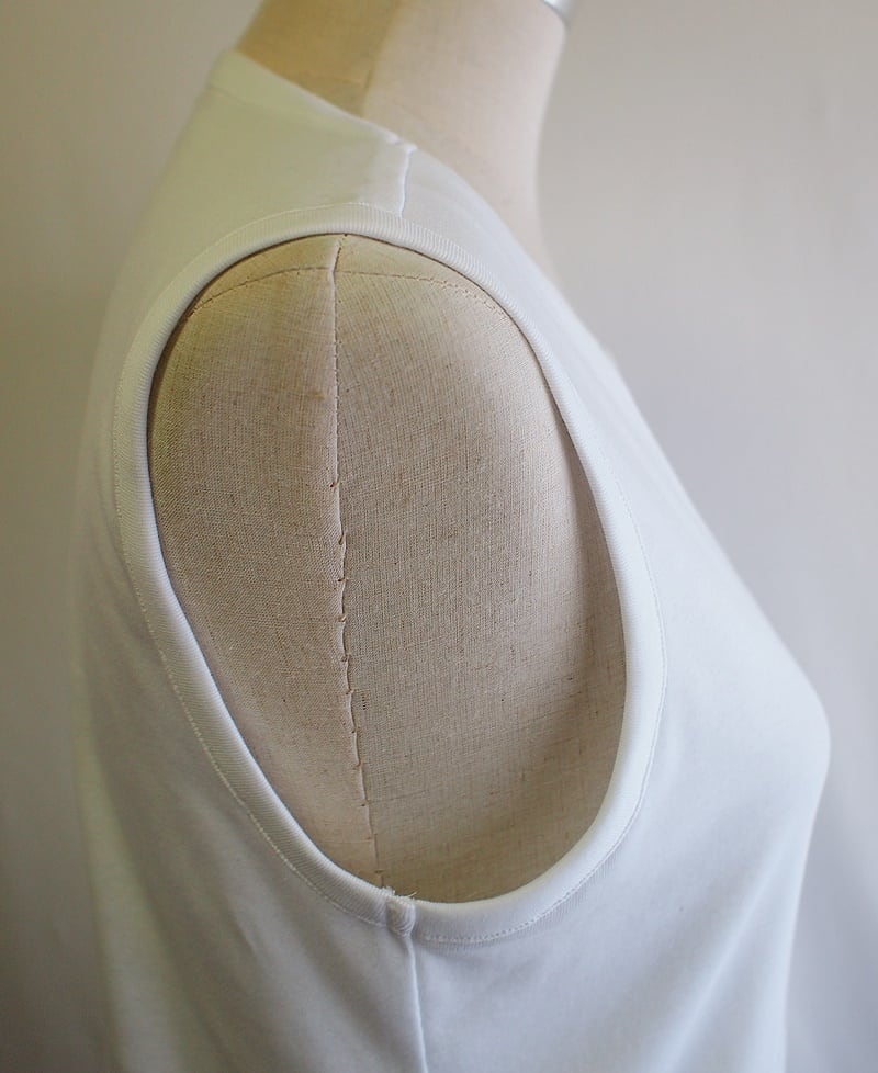 両袖ぐりは共布バインダーで挟み込み、裾の始末は端ロックして折り返しステッチ
