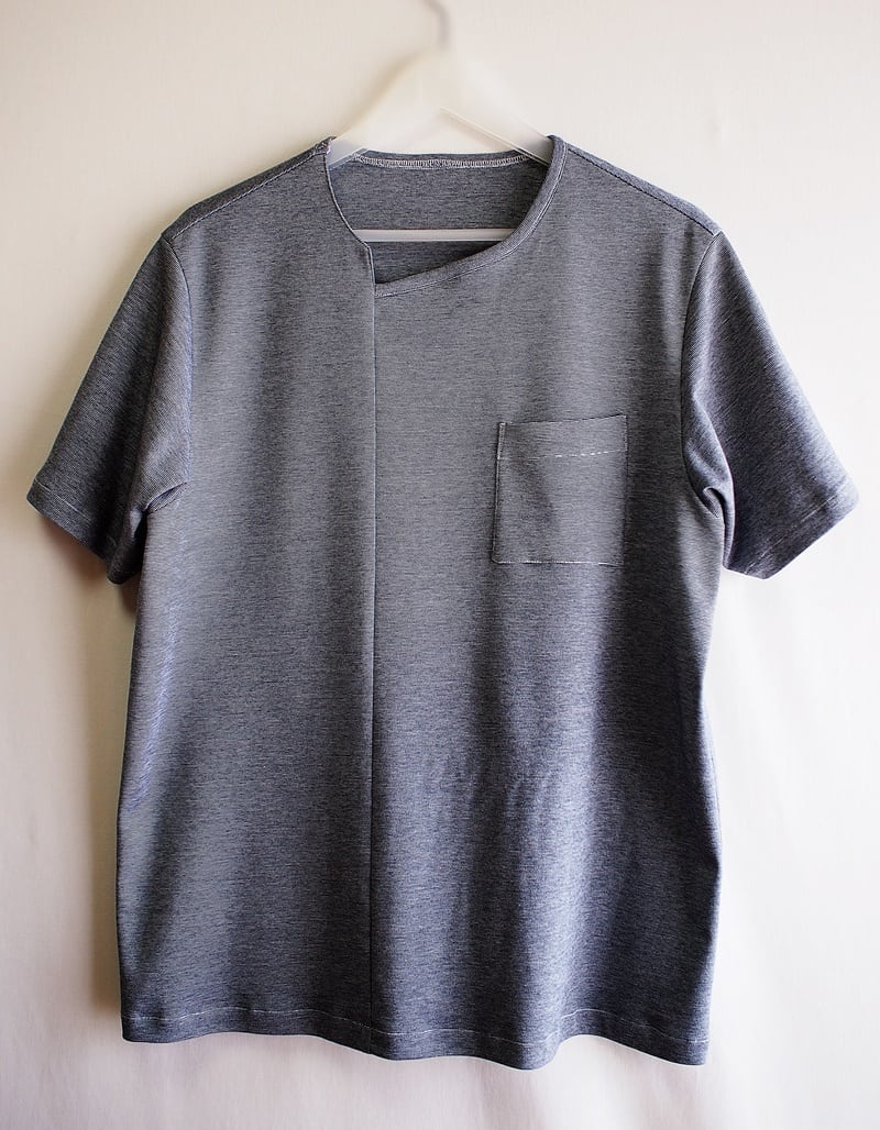 左前身頃にパッチポケット付けて、前身頃右寄りに衿ぐりから裾へ縦のシーム(接ぎ目)を入れ