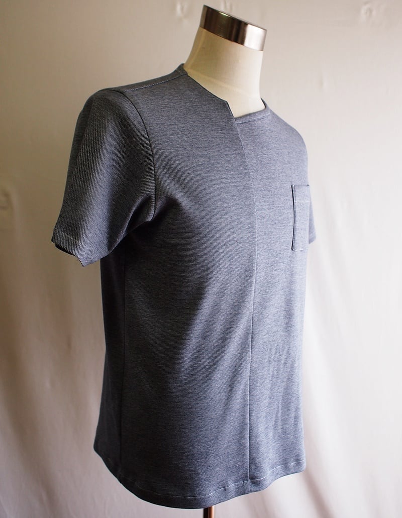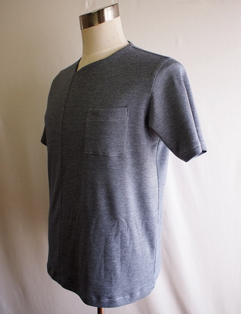 無地のようなボーダー柄のアシンメトリーネックのTシャツ