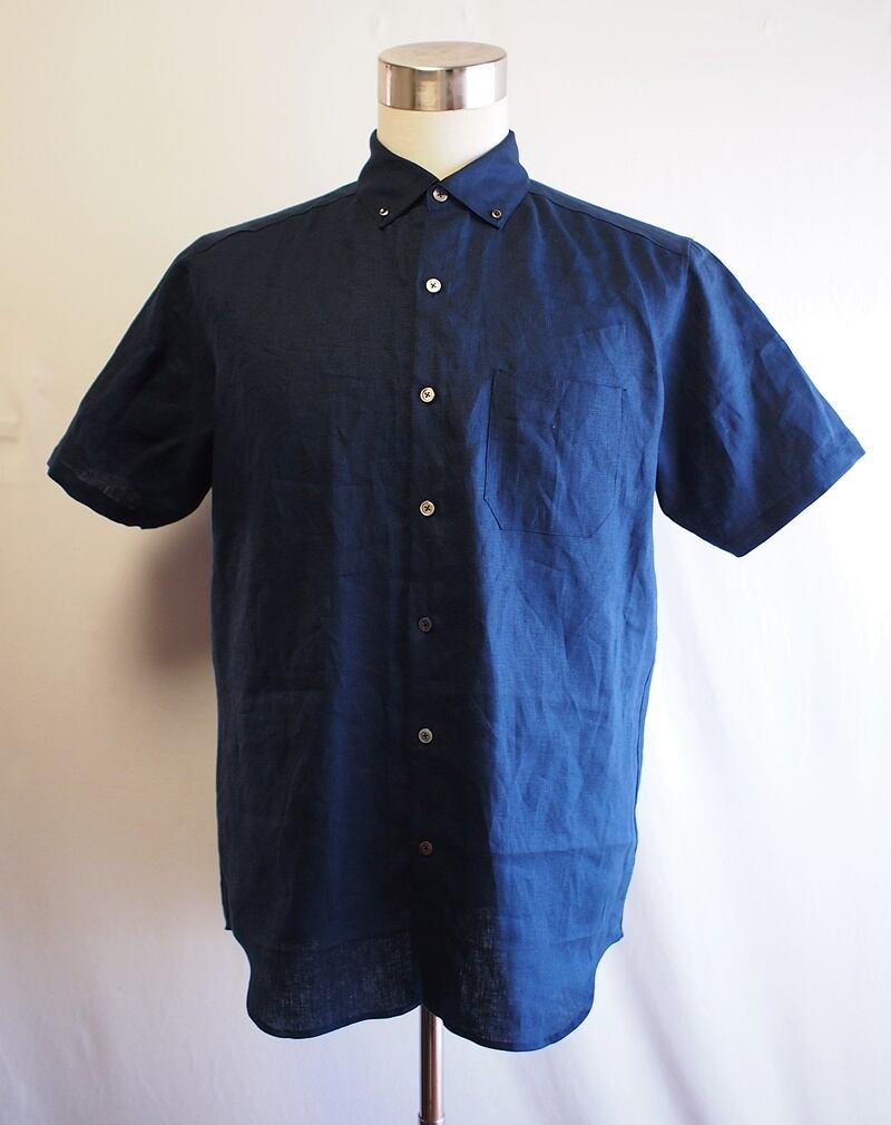 セール65%オフ!たった一つの…メンズ☆40フレンチリネンキャンバス☆ショートスリーブ☆セミワイドカラー☆ボタンダウンシャツ☆ネイビー☆Lサイズ