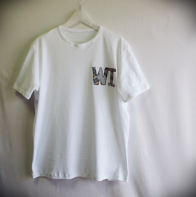 コチラと同じTシャツ素材でWIロゴのパッチワークのレイアウトを変えた、パッチワークWIロゴアップリケのクルーネックT