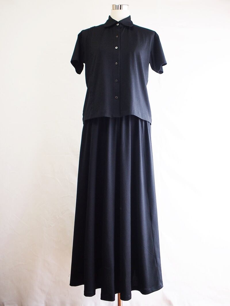 肩幅45.5㎝でドロップショルダー、袖丈16㎝のショートスリーブ、身幅は脇で50㎝、裾52㎝、ヒップラインくらいのやや短めな着丈55㎝