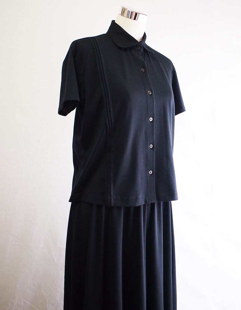 右身頃だけ肩から裾へ5㎜幅のピンタックを縦に3本入れたアシンメトリーなデザイン…ピンタックオンライトボディ