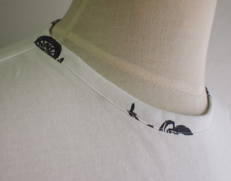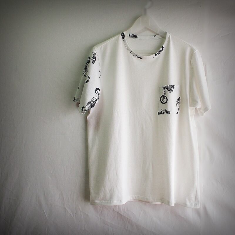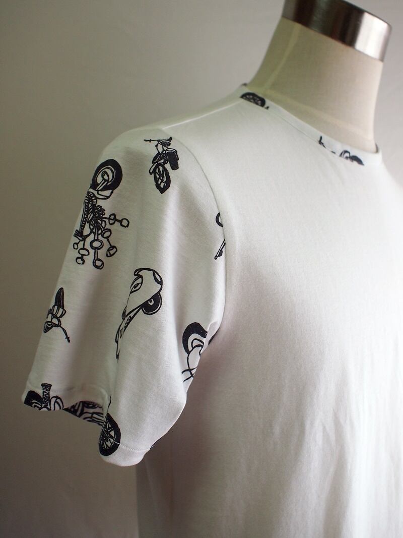 衿ぐり、右袖、左胸パッチポケットには、綿100%のラフィ天竺、アイボリーベースに抑え目な黒でバイクのプリント柄