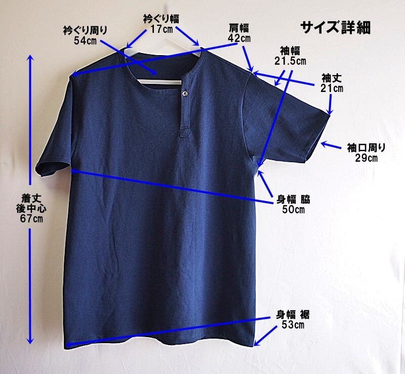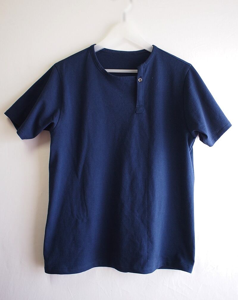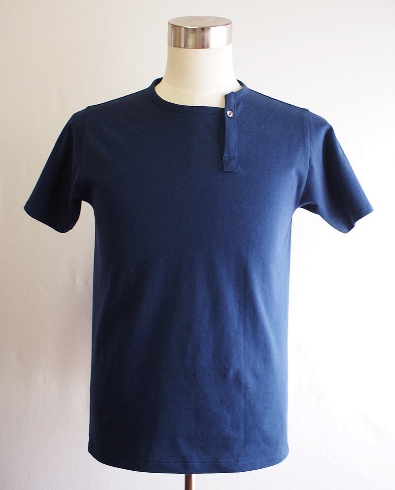しっかりした生地の表情とインディゴのようなダークブルーが男らしいアシンメトリーヘンリーネックTシャツです。